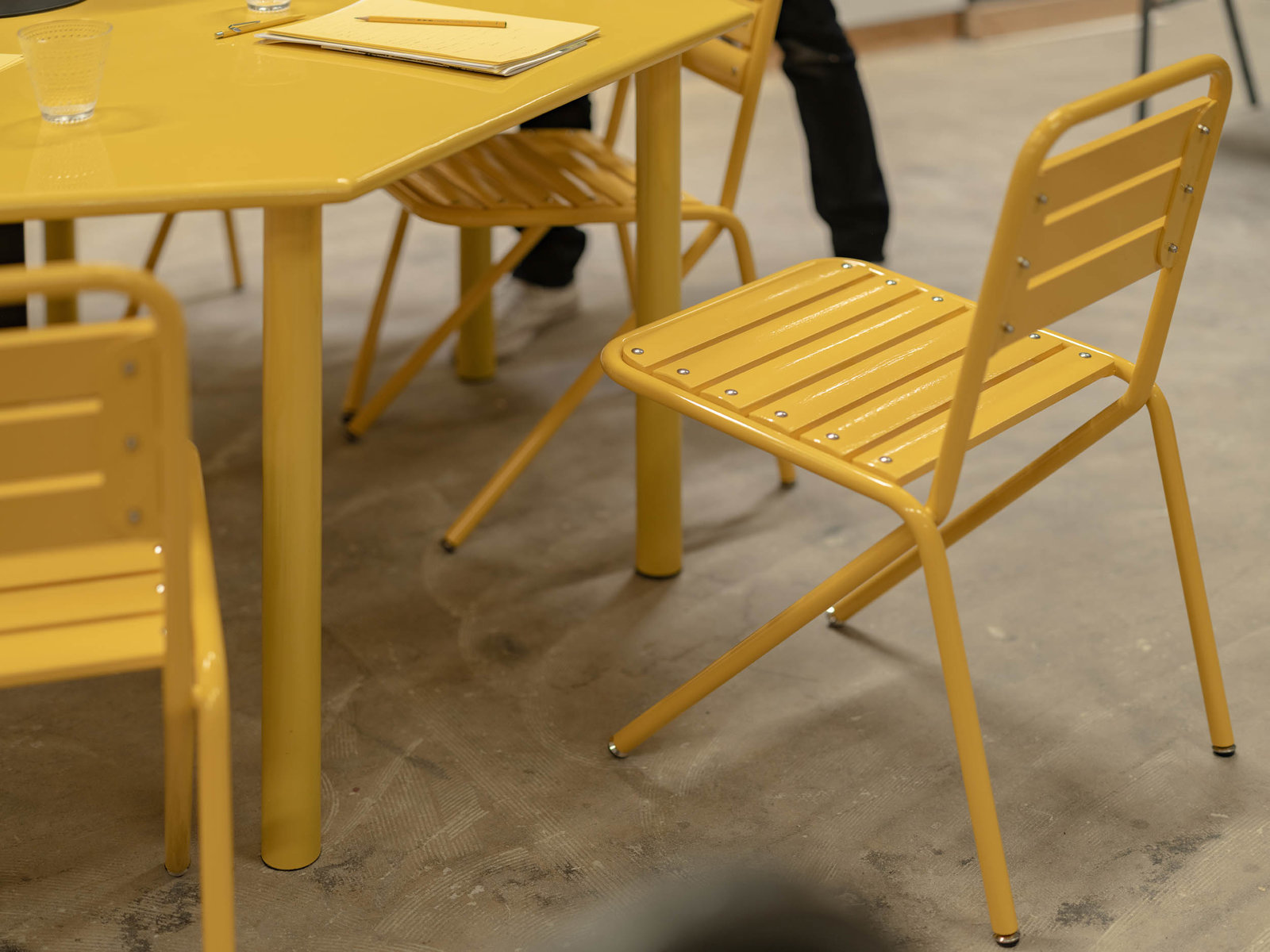 Alltag gestaltete die Inneneinrichtung für die Tagung. Dies beinhaltete Stühle, ein Tischchen und Signaletik in Schalltafeloptik. Und für Licht sorgte der Tester.