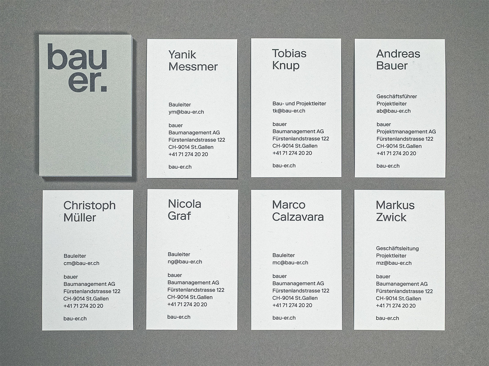 bau-er.chAus Bauer & Partner wurde nach einem längeren Transformationsprozess bauer Bauprojektmanagement. Der neue Name verlangte nach einem neuen Auftritt, den wir komplett entwerfen und umsetzen durften, inklusive Logo und Briefschaften.
