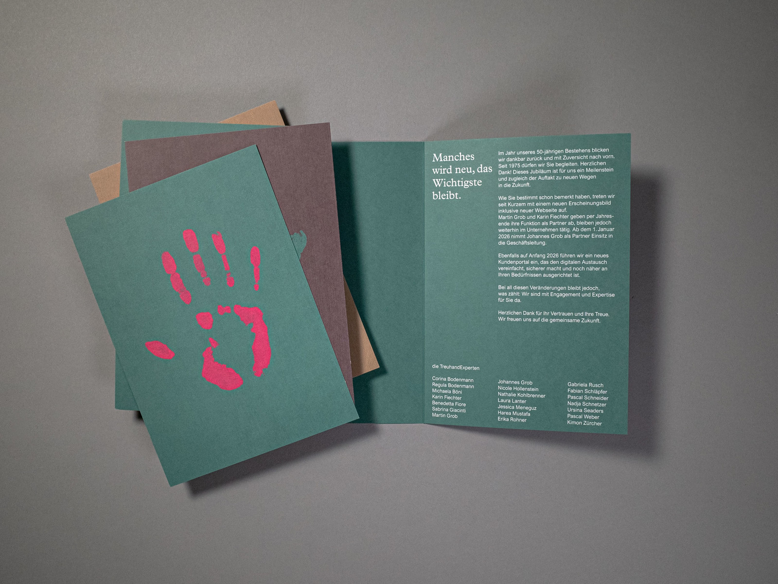 Das neue Erscheinungsbild der TreuhandExperten vereint Tradition und Moderne. Die gewählte Typografie knüpft bewusst an die 50-jährige Geschichte an – sie steht für Beständigkeit und Vertrauen. Ergänzt wird sie durch eine frische Farbwelt, die Leichtigkeit und Zeitgeist hineinbringt.