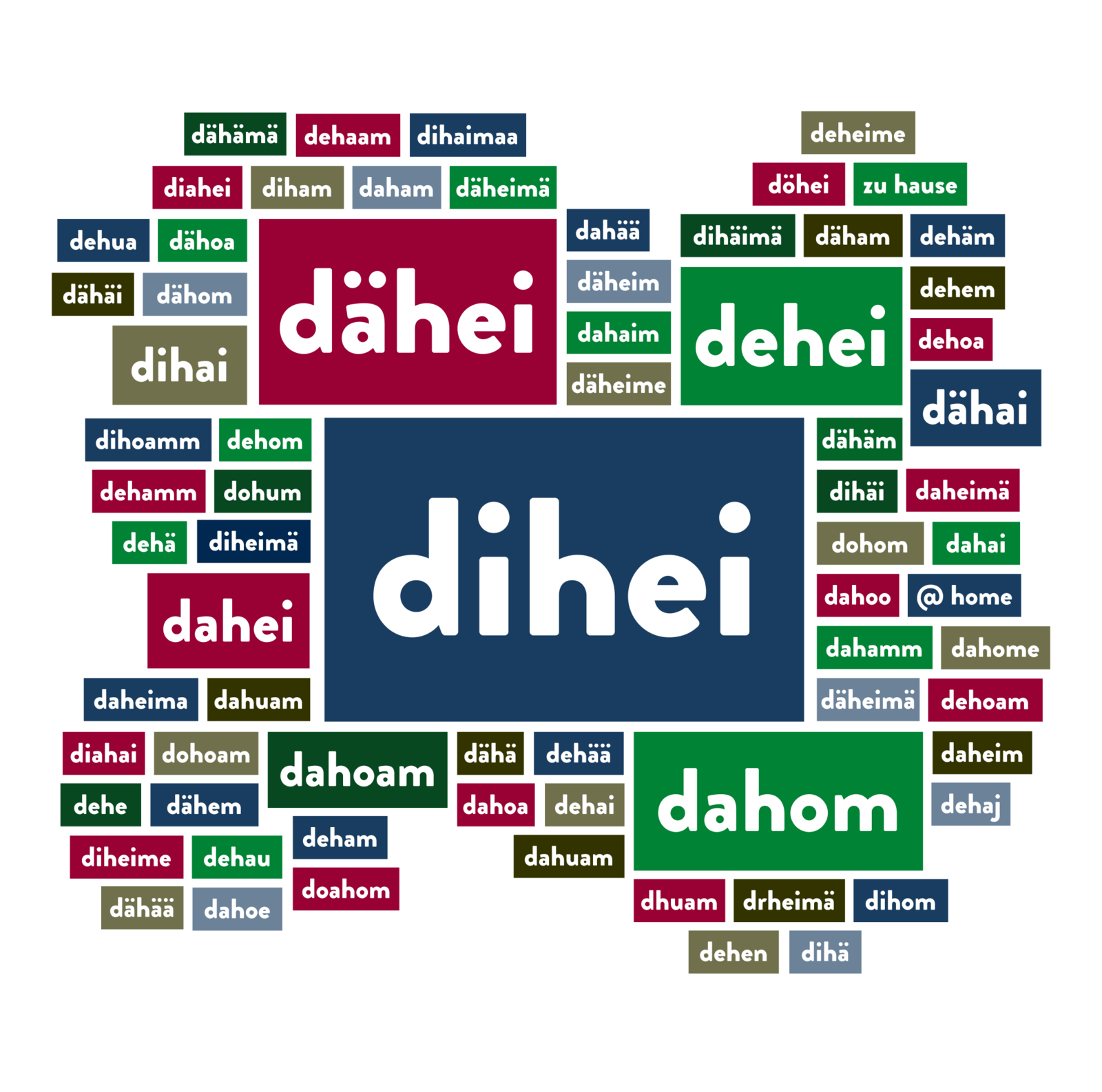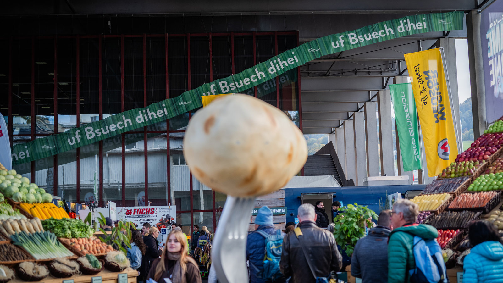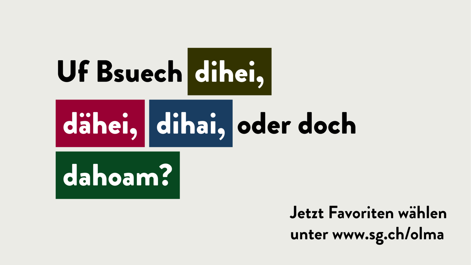 Der Auftritt des Gastkantons St.Gallen sollte bewusst kein «Verkaufsstand» sondern eine Geste für das Heimpublikum werden. Aus der Kernidee «wir sind bei uns zu Gast» haben wir das Motto «uf Bseuch dihei» entwickelt. Damit stellten wir das Zusammengehörigkeitsgefühl in den Fokus des Gastauftritts und machten die OLMA für 11 Tage zum Wohnzimmer des Kantons – wohin auch die Nachbarn von nah und fern eingeladen wurden. Der Auftritt des Gastkantons St.Gallen sollte nicht nur an einem Ort wirken, sondern die Regionen des Kantons und die Menschen miteinbeziehen. Aus diesem Grund fragten wir in einer Onlineumfrage die Menschen des Kanton St.Gallen, wie sie das Motto in Mundart schreiben würden. Über 2’500 Personen haben im Februar 2024 online ihre Stimme abgeben. Damit wurde das Motto bereits früh in der Öffentlichkeit verankert; ausserdem wurde die Diskussion über die Dialektvielfalt von den Medien breit aufgenommen.