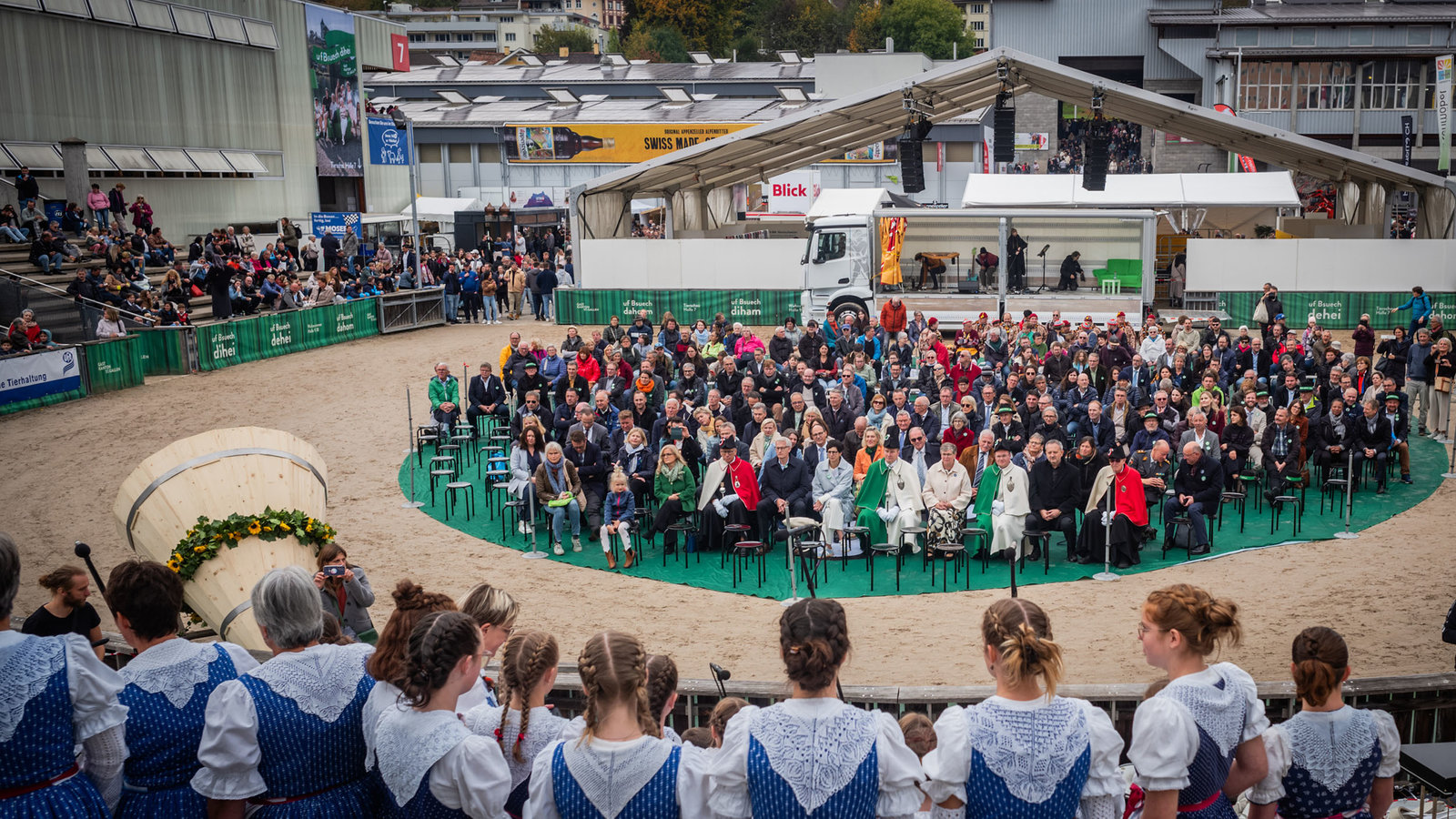 Mittendrin & durch Musik verbunden – nach diesem Motto führten wir den Festakt des Gastkantons St.Gallen in der OLMA-Arena durch. Die Festaktreden von Olma-CEO Christine Bolt und Regierungsrat Beat Tinner wurden umrahmt von Musik aus dem Kanton St.Gallen. Nach der Idee von Alltag wurde der Festakt wie eine modernen «Stubete» aufgebaut: Das Publikum war ganz nach dem Motto «uf Bsuech dihei» für einmal nicht ausserhalb, sondern mitten im Geschehen. Die Zuschauerinnen und Zuschauer wurden eingeladen, nicht nur von der Tribüne aus zuzuschauen, sondern auch in der Arena auf dem grossen St.Galler-Wappen zusammenzukommen.
