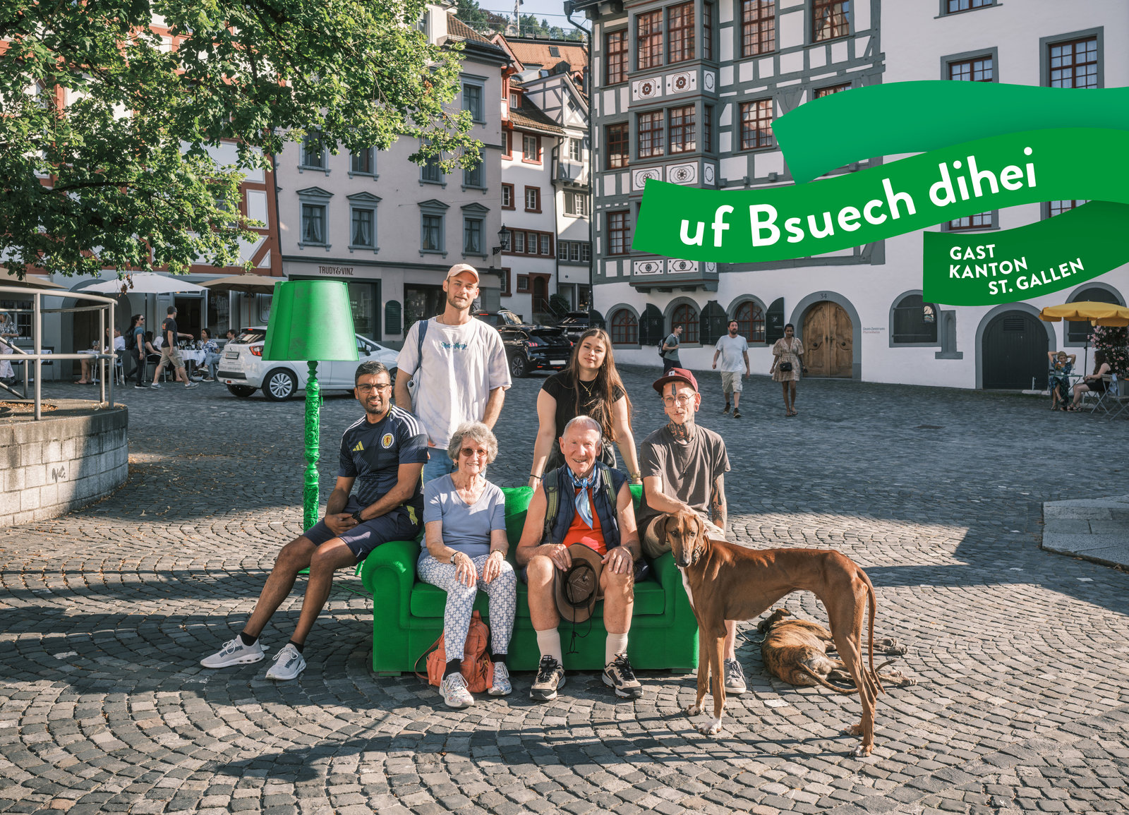 Als flexibles Gestaltungselement entwickelten wir die grünen Ribbons, die zum grünen Wohnzimmer passten und eine festliche Stimmung verbreiteten. Für das Keyvisual reisten wir mit einem grünen Wohnzimmer um den Ringkanton und liessen für das Foto Menschen aus Wittenbach, Altstätten, Werdenberg, Wattwil bis Rapperswil-Jona auf dem Sofa Platz nehmen.