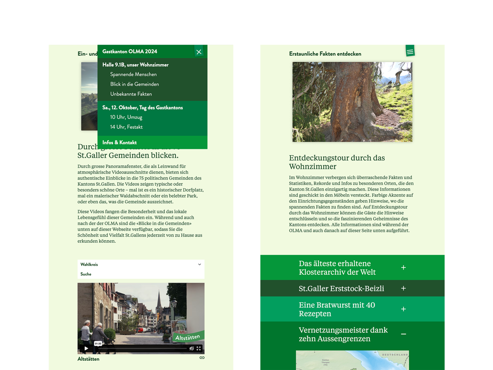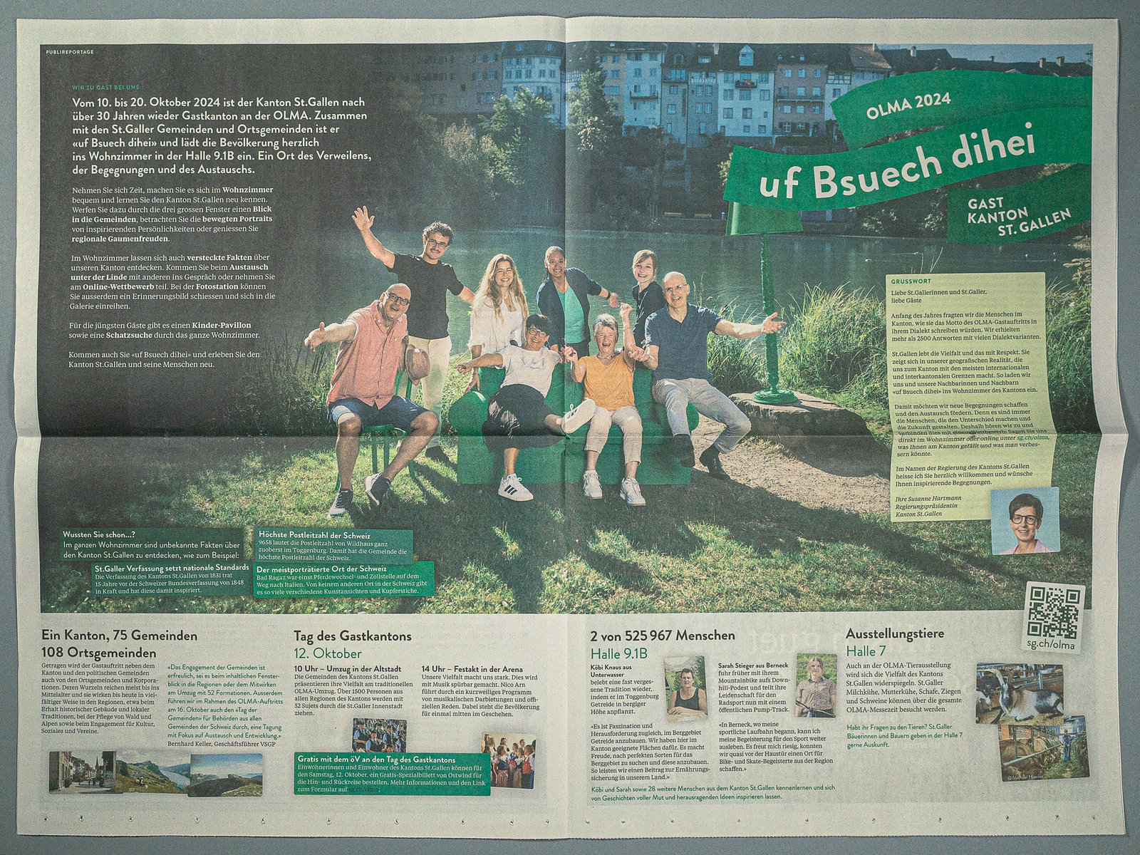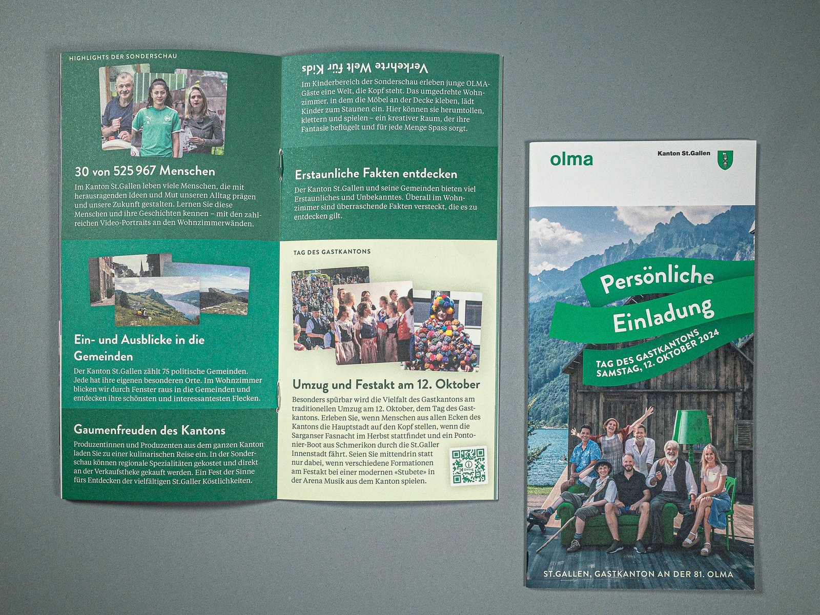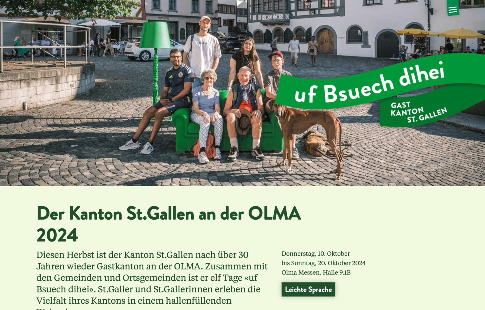 sg.chFür den Gastauftritt des Kantons St.Gallen an der OLMA 2024 hatten wir die kreative Leitung inne. In diesem Rahmen entwickelten wir mit der St.Galler Regierung, den Olma Messen St.Gallen und den Gemeinden das Gesamtkonzept des Auftritts und waren verantwortlich für den Gestaltungsrahmen, die kreativen Umsetzungen und die Kommunikation. Zudem kreierten wir zusammen mit Konform die Idee des Wohnzimmers für die Sonderschau. Im hallenfüllenden Wohnzimmer konnte man es sich bequem machen, bisher Unbekanntes über den Kanton St.Gallen erfahren, neue Begegnungen machen und mit den Nachbarn neben sich ins Gespräch kommen. Dazu schufen wir abwechslungsreiche Inhalte der Ausstellung: die Menschen aus dem Kanton St.Gallen mit animierten Portraits in den Fokus zu stellen, versteckte Fakten über den Kanton erfahrbar machen, Blicke in die 75 Gemeinden des Kantons zu zeigen, die Vereinsvielfalt anhand von Gegenständen in einem Vereinsschrank sichtbar zu machen. Aus Nachhaltigkeitsgründen haben wir die grünen Wohnzimmermöbel nach der Messe an die St.Galler Bevölkerung verschenkt und dafür ein Reservationsprozess mit Online-Formular aufgebaut. So lebt nun ein Teil der Sonderschau des Gastkantons in rund 100 St.Galler Haushalten weiter.