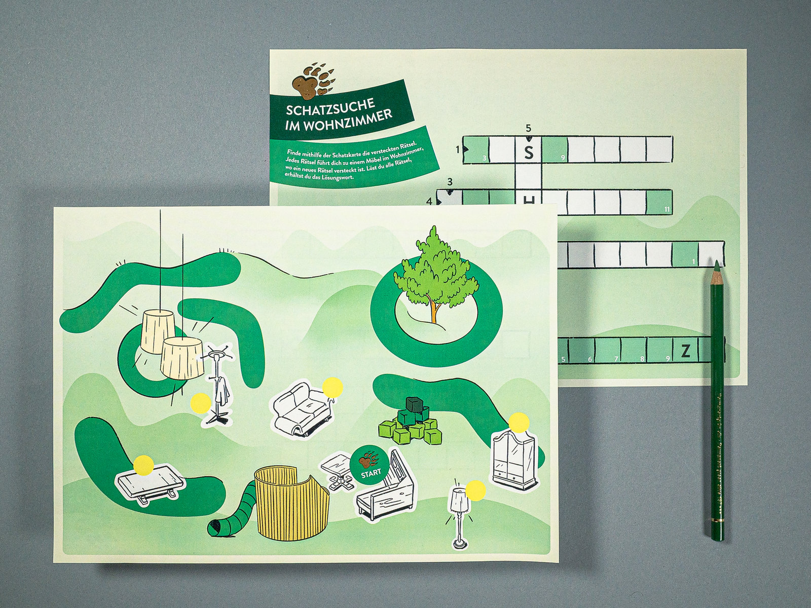 Im Rahmen des Familienparcours der OLMA entwickelten wir für die kleinen Besucher:innen eine Schatzsuche. Die Kinder machten sich auf, das Wohnzimmer des Gastkantons St.Gallen zu entdecken und ihre eigene Superkraft zu finden. Unter, hinter und in den Möbeln waren Teile der Lösung versteckt. Mithilfe einer Schatzkarte konnten sie diese finden, das Rätsel knacken und die Superkraft in Form eines Temporär-Tattoos auswählen. Unterstützt wurden die Kinder von SuperTed – einem übergrossen Teddybären mit grünem Umhang.