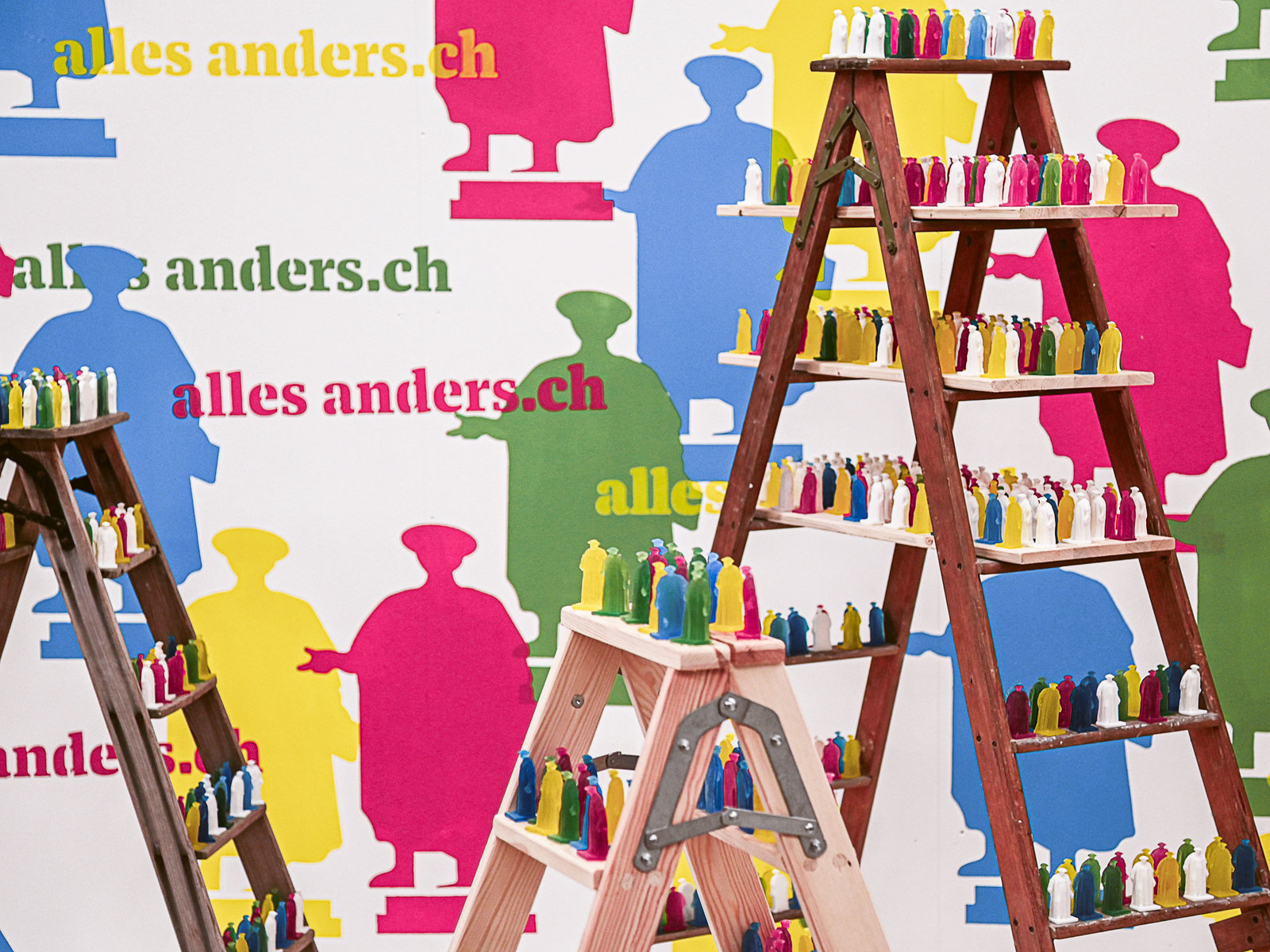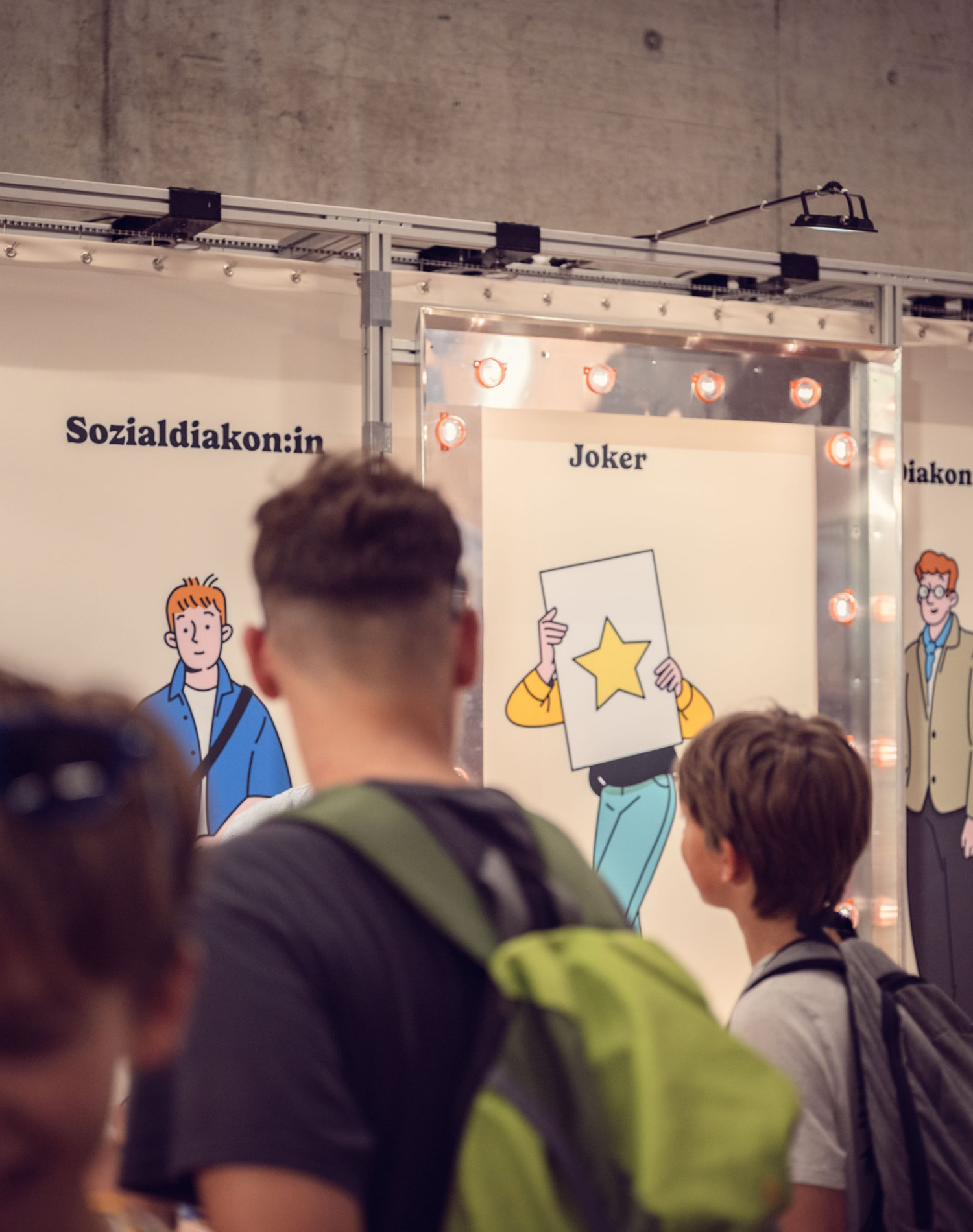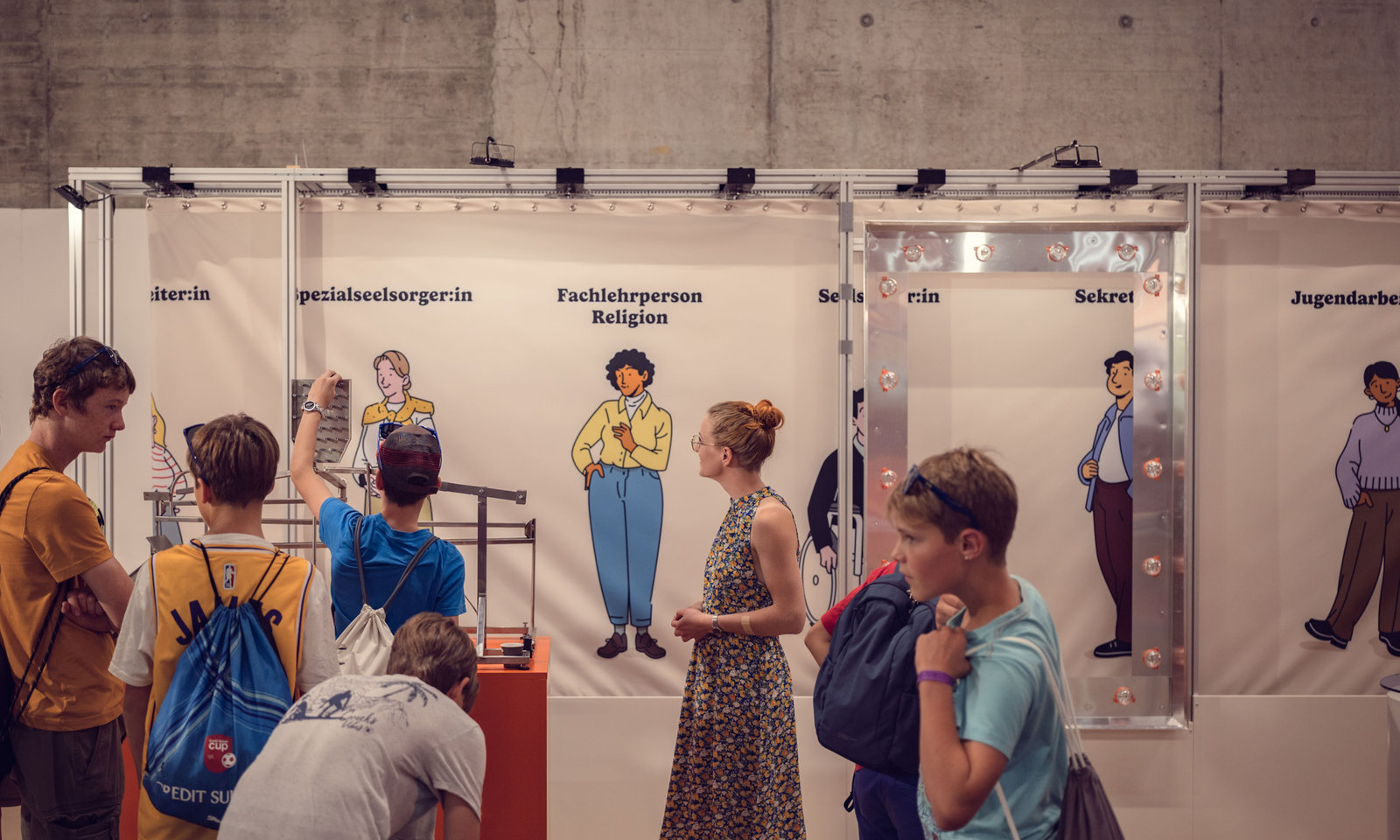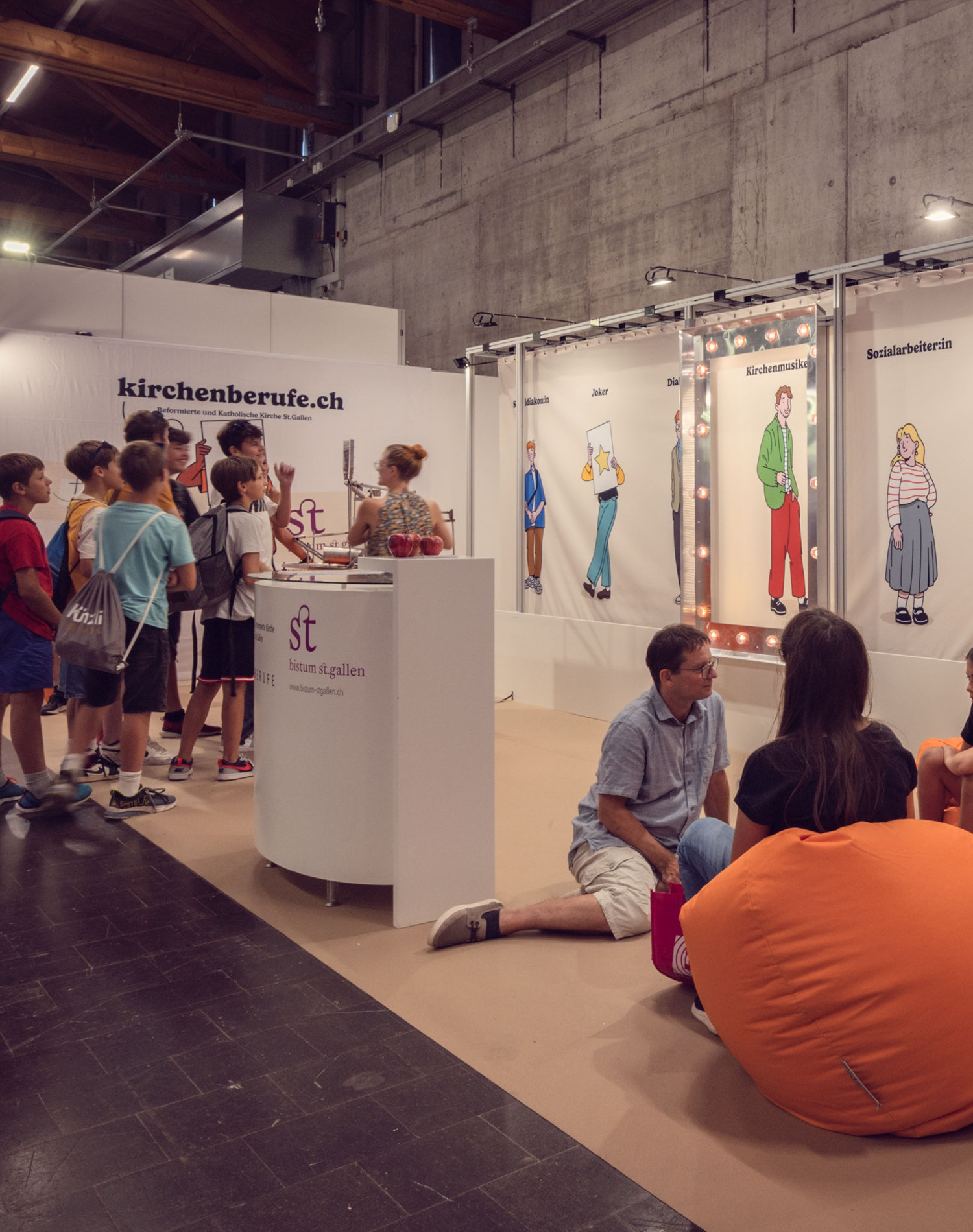 An der Ostschweizer Bildungsausstellung (OBA) 2024 trat die Evangelisch-reformierte Kirche gemeinsam mit dem Bistum St.Gallen auf. Eine unterhaltsame Kügelibahn funktionierte dabei als Berufsmaschine und wurde zum Magnet für die jungen Erwachsenen. Das lief wie folgt ab: Die Kugel konnte unterschiedliche Wege gehen, längere und kürzere. Wenn sie im Ziel angekommen war, stoppte eine Art Laufband bei einem bestimmten Kirchenberuf, der dann wiederum den Besuchenden von den Experten und Expertinnen vor Ort erklärt wurde. Idee, Umsetzung, Illustrationen und Projektleitung waren von uns.