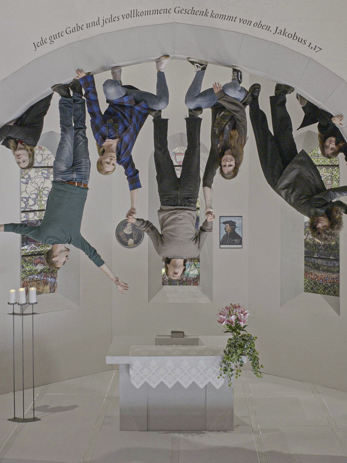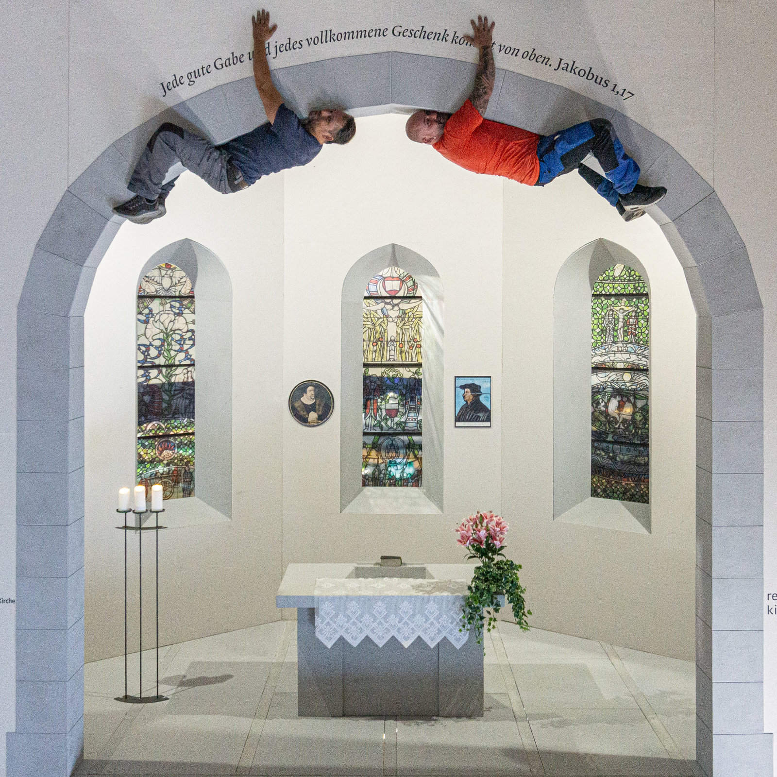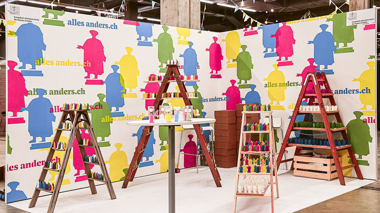 Es ist wieder so weit: Die reformierte Kirche geht an die Olma. Wir durften für sie den neuen Messestand konzipieren – und der steht für einmal Kopf. Denn wie sagt man so schön? Alles Gute kommt von oben. Oder nach Jakobus 1.17: Jede gute Gabe und jedes vollkommene Geschenk kommt von oben. Das Setting ist der Alten Kirche Wollishofen nachempfunden, die beiden Bilder im Hintergrund zeigen Zwingli und Vadian, weil die St.Galler reformierte Kirche an der diesjährigen Messe gemeinsam mit der Zürcher Kirche auftritt.