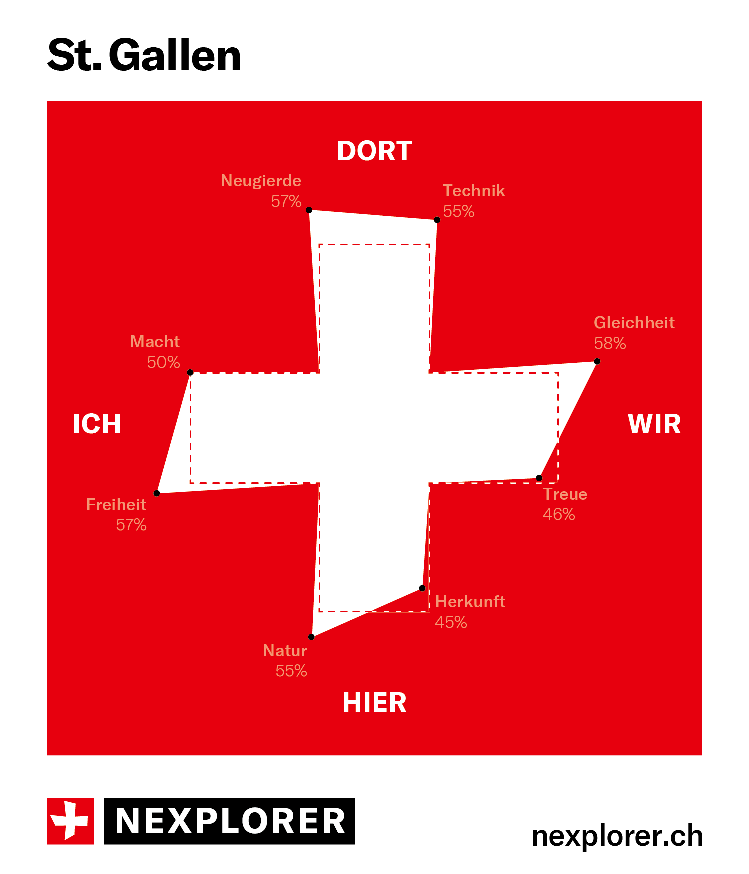 NEXPLORER ist die neue Meinungsumfrage zum Zusammenleben im 21. Jahrhundert. Gemeinsam wollen wir herausfinden, was uns als Gesellschaft bewegt, welche Gemeinsamkeiten wir pflegen, was uns glücklich macht – und was nicht. Die Wünsche und Werte der Teilnehmenden werden dabei als individualisiertes Schweizerkreuz abgebildet.