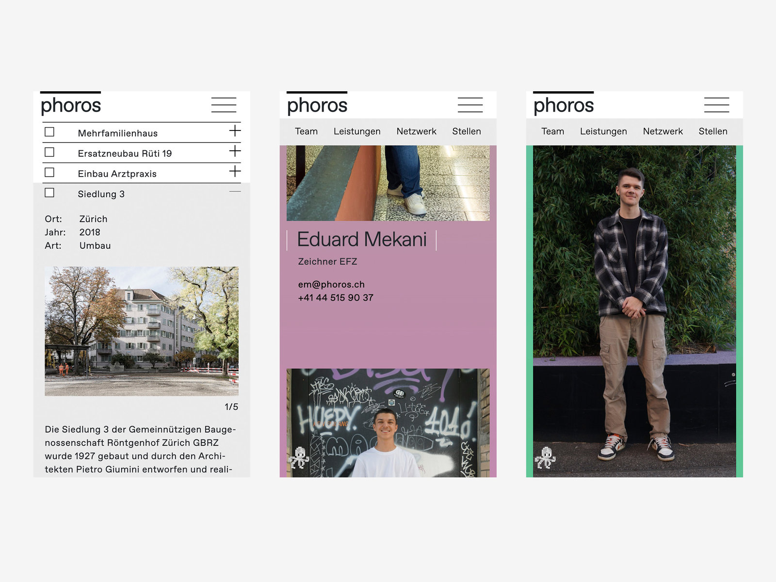 Der neue Name der phoros AG verlangte natürlich auch nach einem neuen Webauftritt, den wir komplett entwerfen und umsetzen durften. Die unterschiedlichen Bildhintergründe der Porträts passen zur Individualität der phoros-Mitarbeitenden und unterstreichen ihre Buntheit.