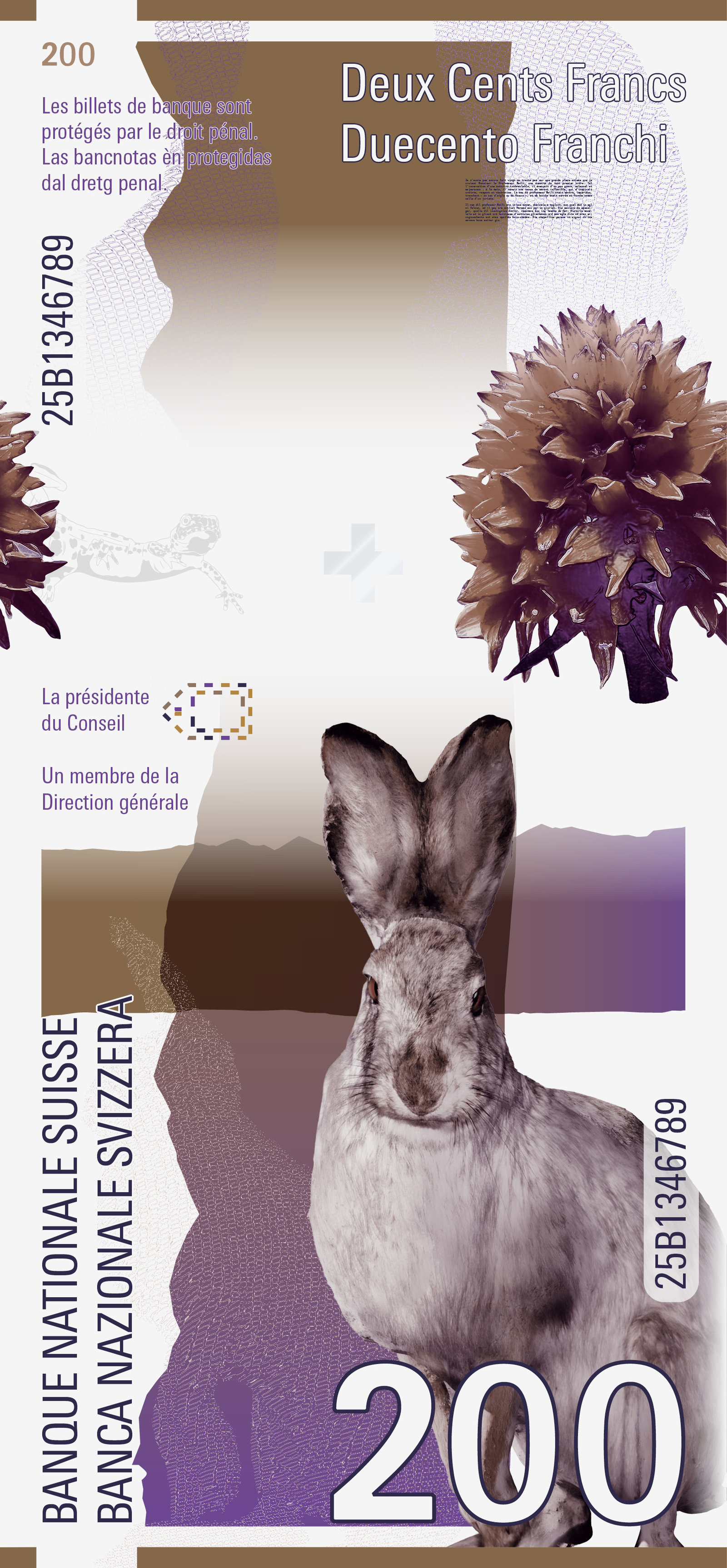 Von den Tälern bis zu den Gipfeln zeigt die Schweiz eine besondere Wechselwirkung: Mensch und Natur prägen und beeinflussen sich gegenseitig. Diese Idee bildet den Kern unseres Entwurfs. Jede Banknote erzählt diese Beziehung auf zwei Seiten: Vorne der Mensch, hinten die Natur.