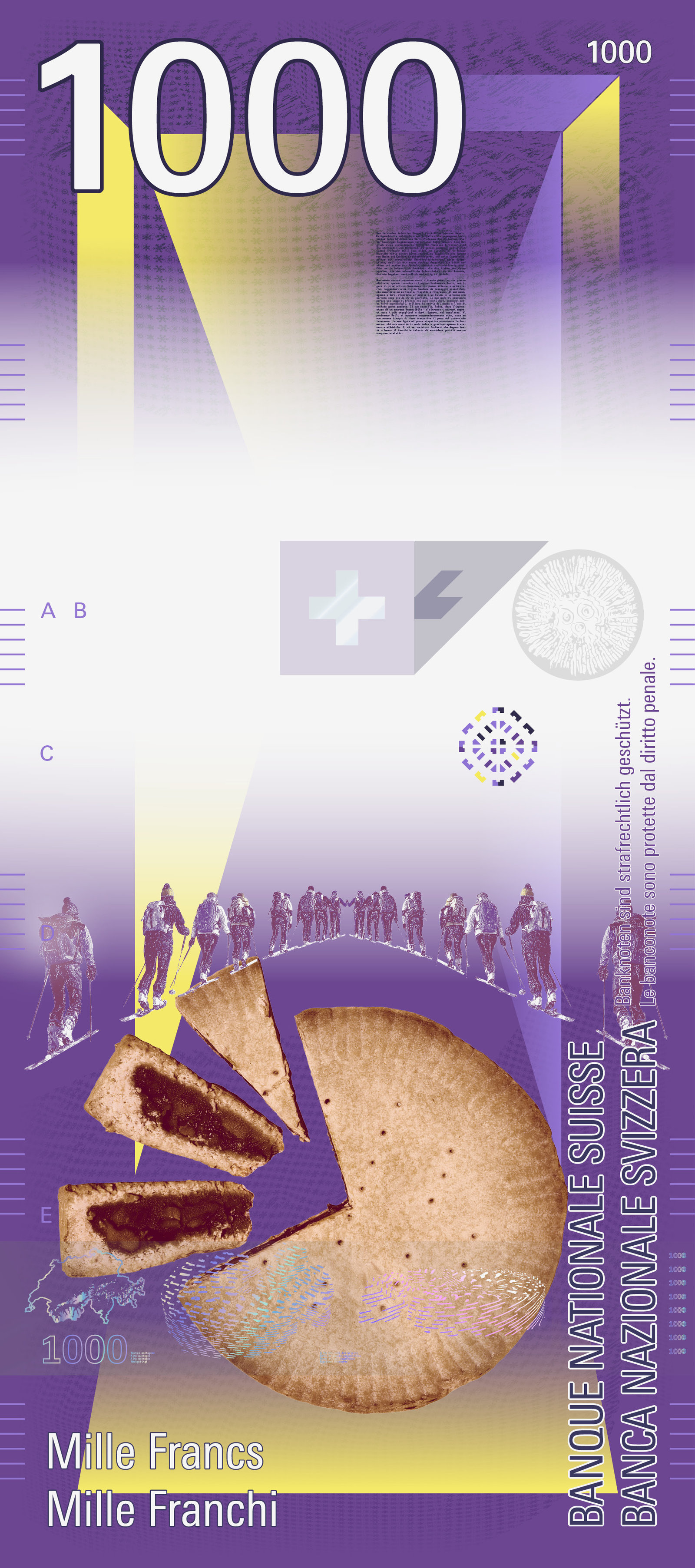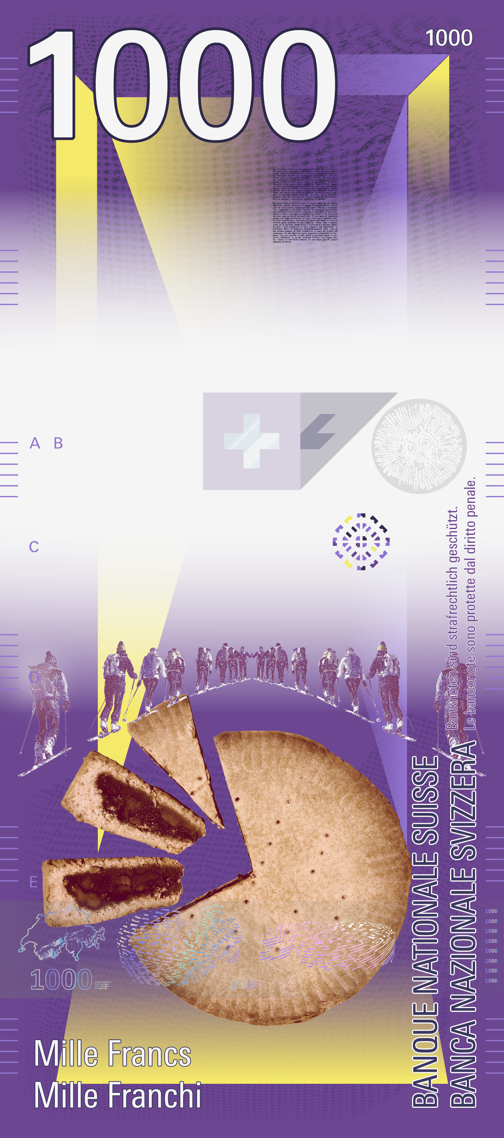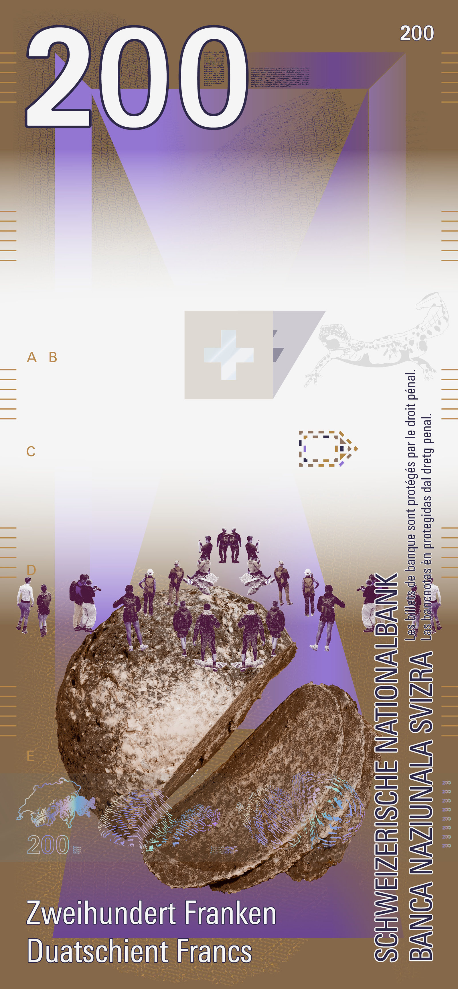 Auf der Vorderseite sorgt ein transparentes Schweizerkreuz für einen visuellen Anker. Es bleibt auf jeder Note an derselben Stelle und lässt den Blick durch die Serie hindurchwandern. Sein Schatten verändert sich mit dem Lauf der Sonne – ein subtiler Hinweis auf Zeit, Licht und Perspektive.