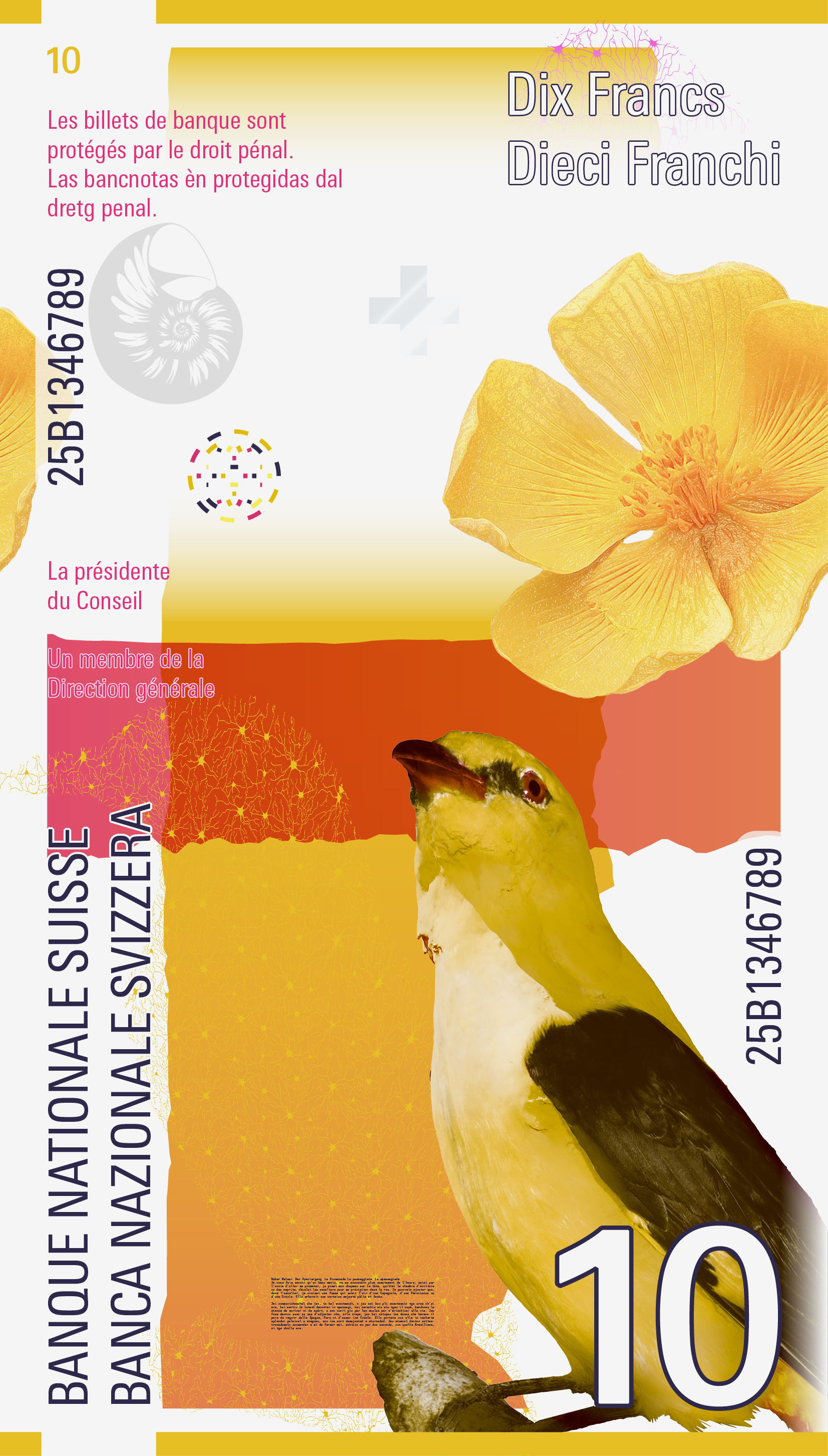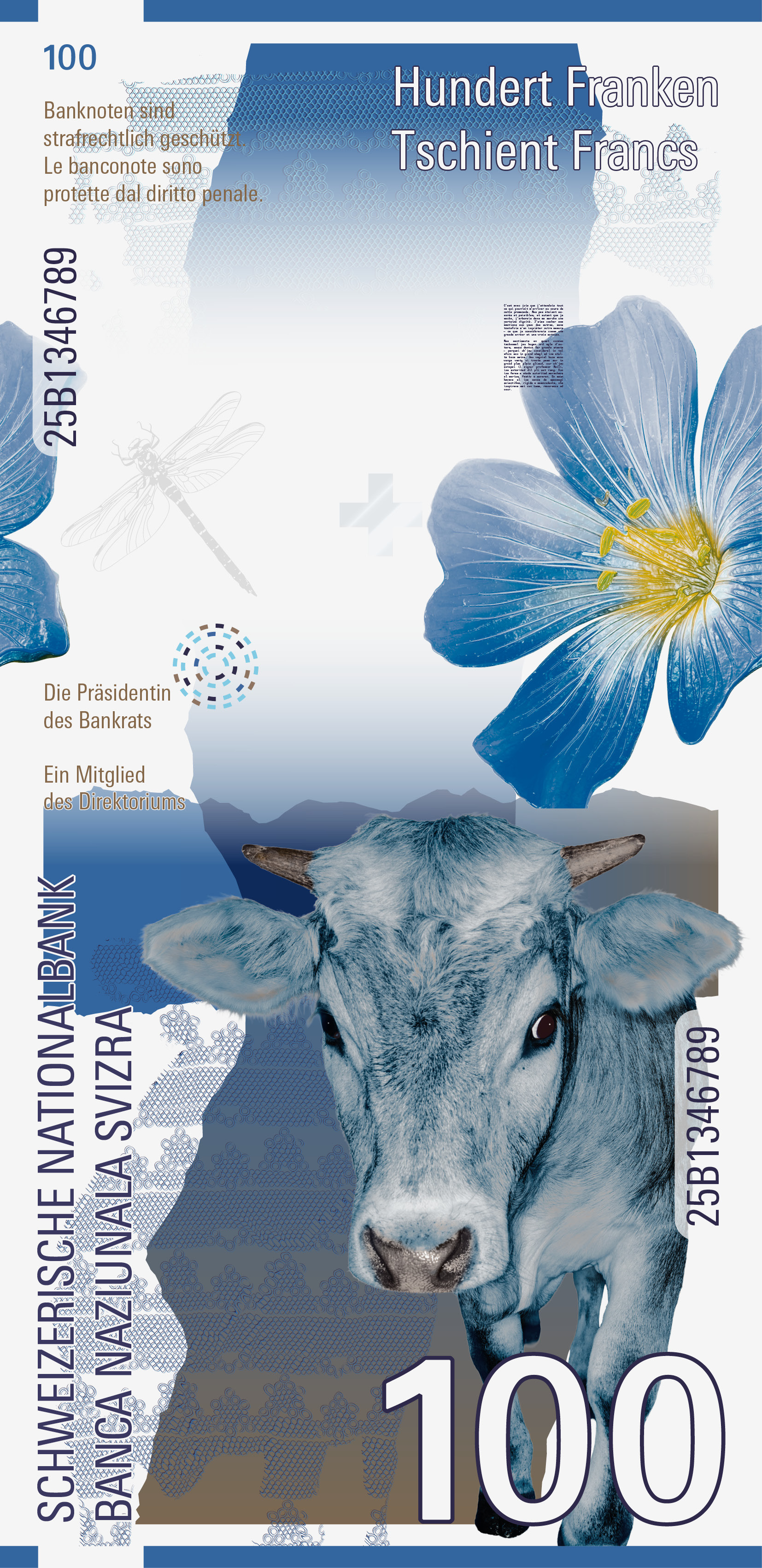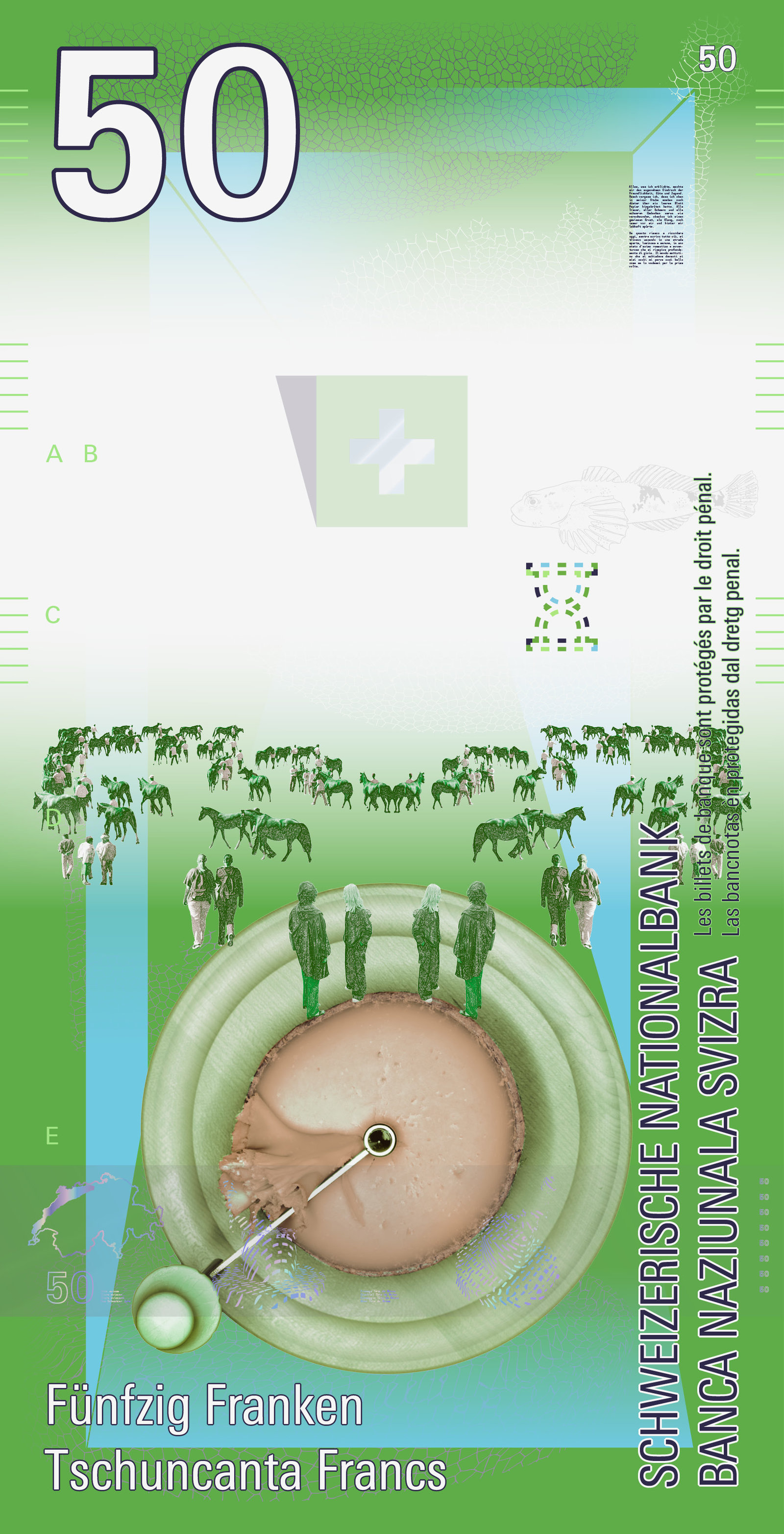Der Text erscheint über die gesamte Banknotenserie hinweg – in allen vier Landessprachen. So entsteht eine leise, poetische Verbindung zwischen den einzelnen Noten.