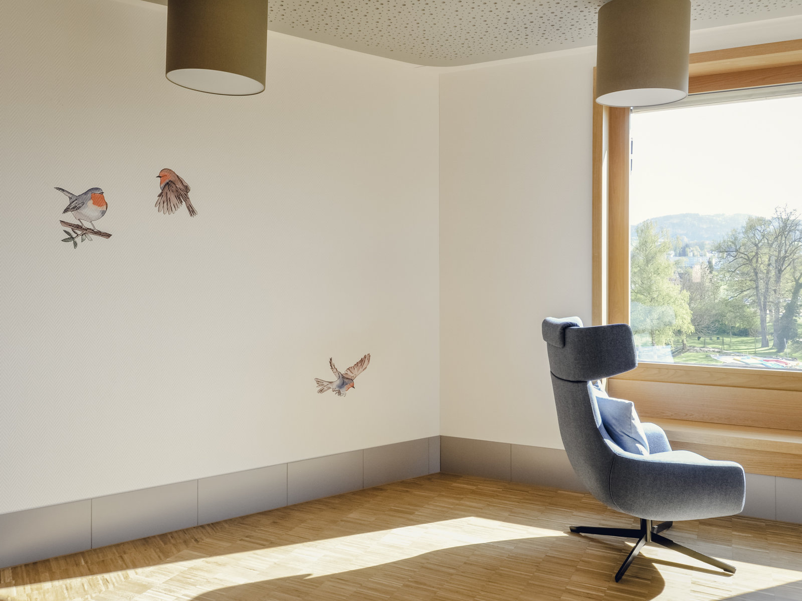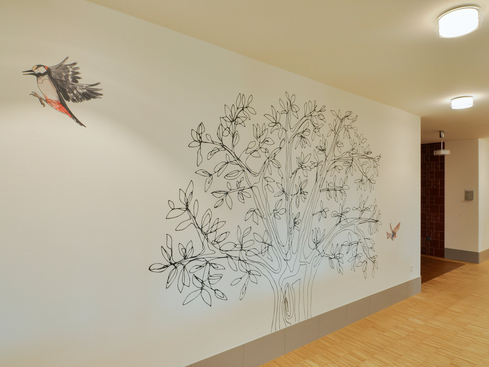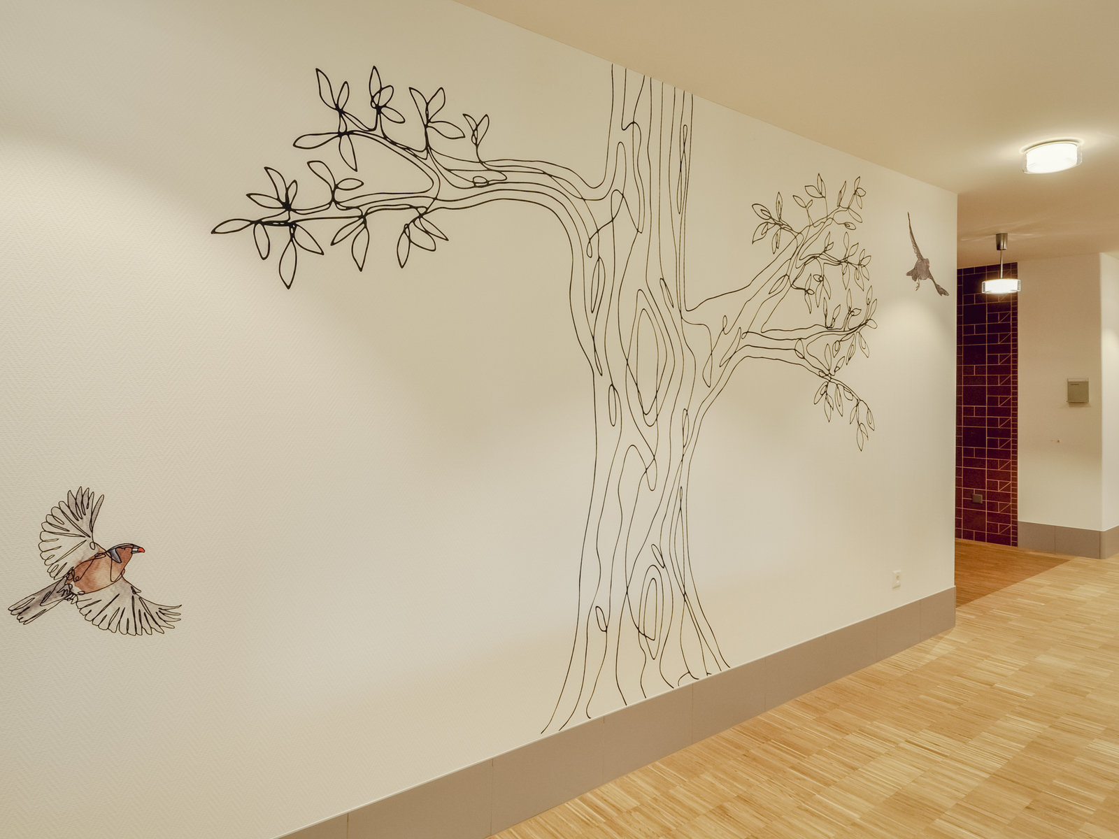 seniorenzentrum-uzwil.chUnsere Idee und unser Anliegen, für die betagten Bewohner:innen ein bisschen Leben und ein Stück Natur in ihre neu gebaute Umgebung hineinzubringen, wurde von den Architekten und der Bauherrschaft rasch und mit Begeisterung aufgenommen. Vögel sind für viele Menschen Sympathieträger, sie wecken Interesse und vielleicht gar Erinnerungen. Die von uns handgezeichneten Vogelarten sind aber nicht nur schmückendes Beiwerk, sondern dienen zudem der Orientierung. So lassen sich die drei Wohngeschosse mit insgesamt sechs Trakten leichter identifizieren. Jeder Trakt wird von einer einheimischen, unverkennbaren Vogelart bewohnt. So merkt sichs leicht, ob man bei den Amseln oder bei den Türkentauben zu Hause ist.
