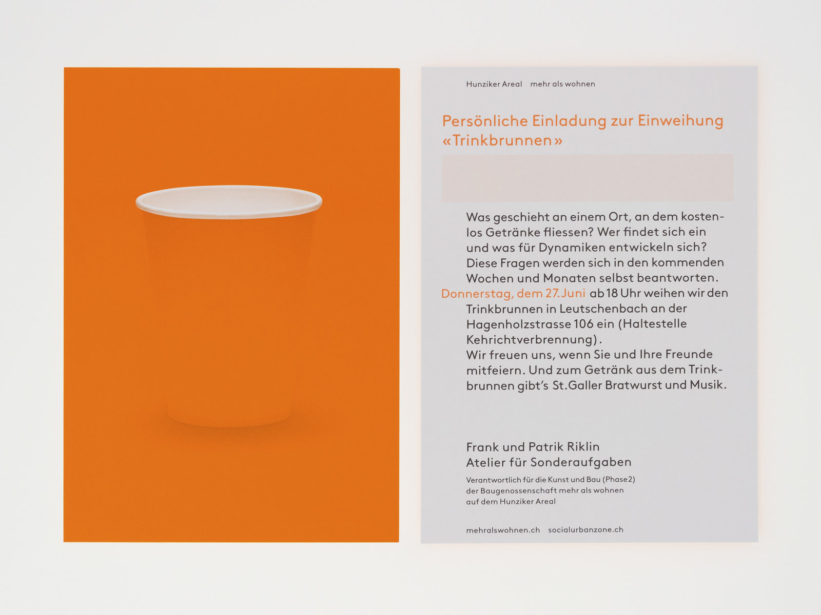 Mit der Idee «Trinkbrunnen» gewann das Atelier für Sonderaufgaben, Patrik und Frank Riklin, den Kunst-am-Bau-Wettbewerb für ein wegweisendes Bauprojekt der Wohngenossenschaft Zürich. Schlussendlich wird dieser Getränkeautomat, platziert als Schlitz in einer Fassadenwand der Wohnüberbauung «mehr als wohnen», aufgrund sozialer Aktivitäten der Bewohnerinnen und –bewohner diese mit Getränken belohnen. Bevor dies so weit ist, läuft eine Probezeit ausserhalb der dieser auch für Zürich riesigen Baustelle. In der Geschäftsstelle (mehr als wohnen) haben die Künstler bereits einen solchen Getränkeschlitz installiert und verschenken – noch – verschiedene Getränke den Vorbeikommenden in Leutschenbach.