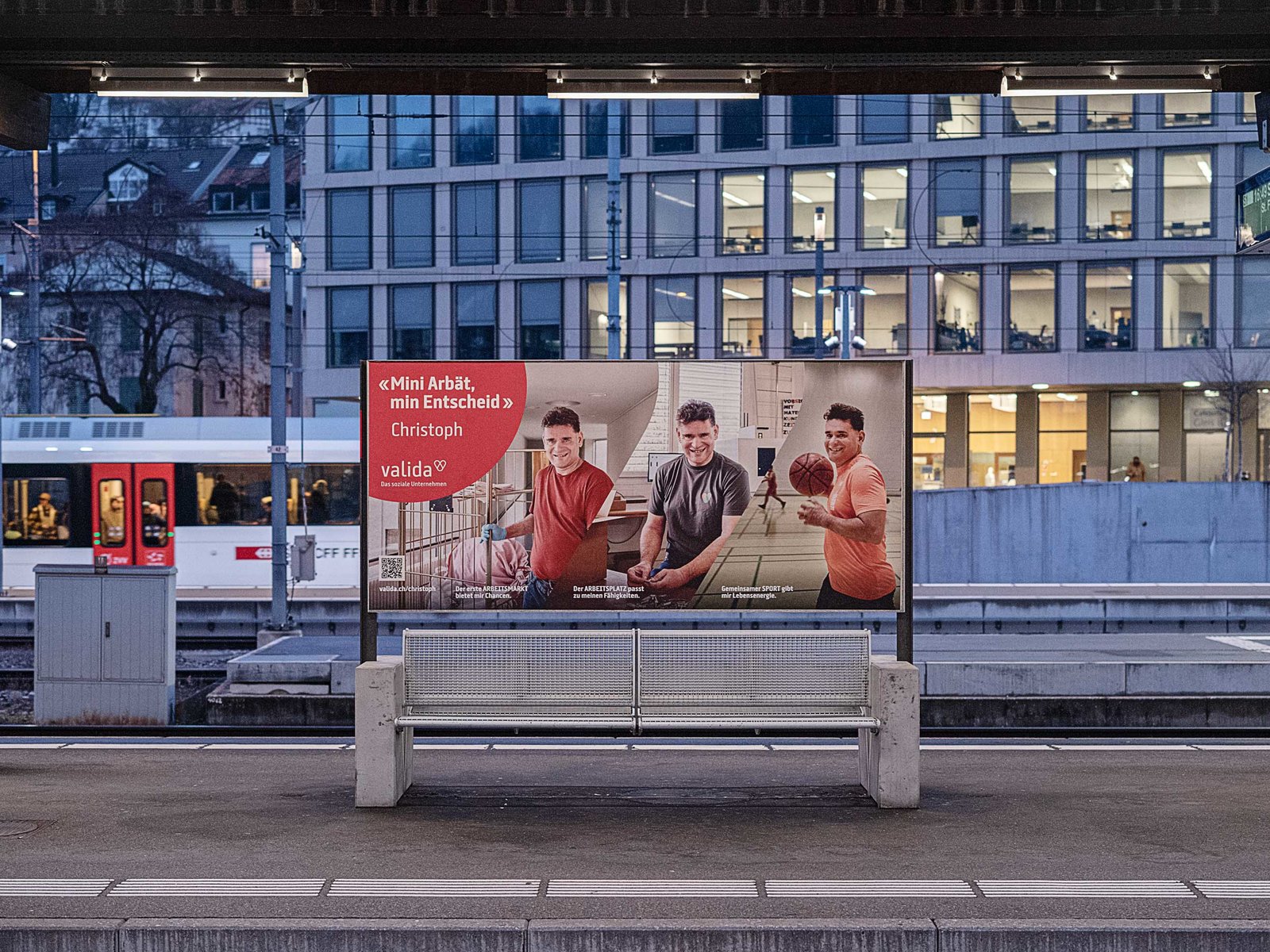 Die Kampagne begleitet fünf Personen mit erhöhtem Unterstützungsbedarf im täglichen Leben bei der Valida, wobei die Bandbreite und Vielseitigkeit der Arbeit bildhaft aufgezeigt wird. Der berufliche Alltag bei der Valida kann flexibel gestaltet werden und das Beschäftigungsangebot wird durch ein breites Wohn- und Freizeitangebot ergänzt. Wir durften die Kampagne entwerfen und bei der Umsetzung unterschiedlichster Werbemittel federführend sein: von Plakaten über Animationen für ÖV-Screens bis zu Inseraten, Text, Landingpage und Social-Media-Beiträgen.