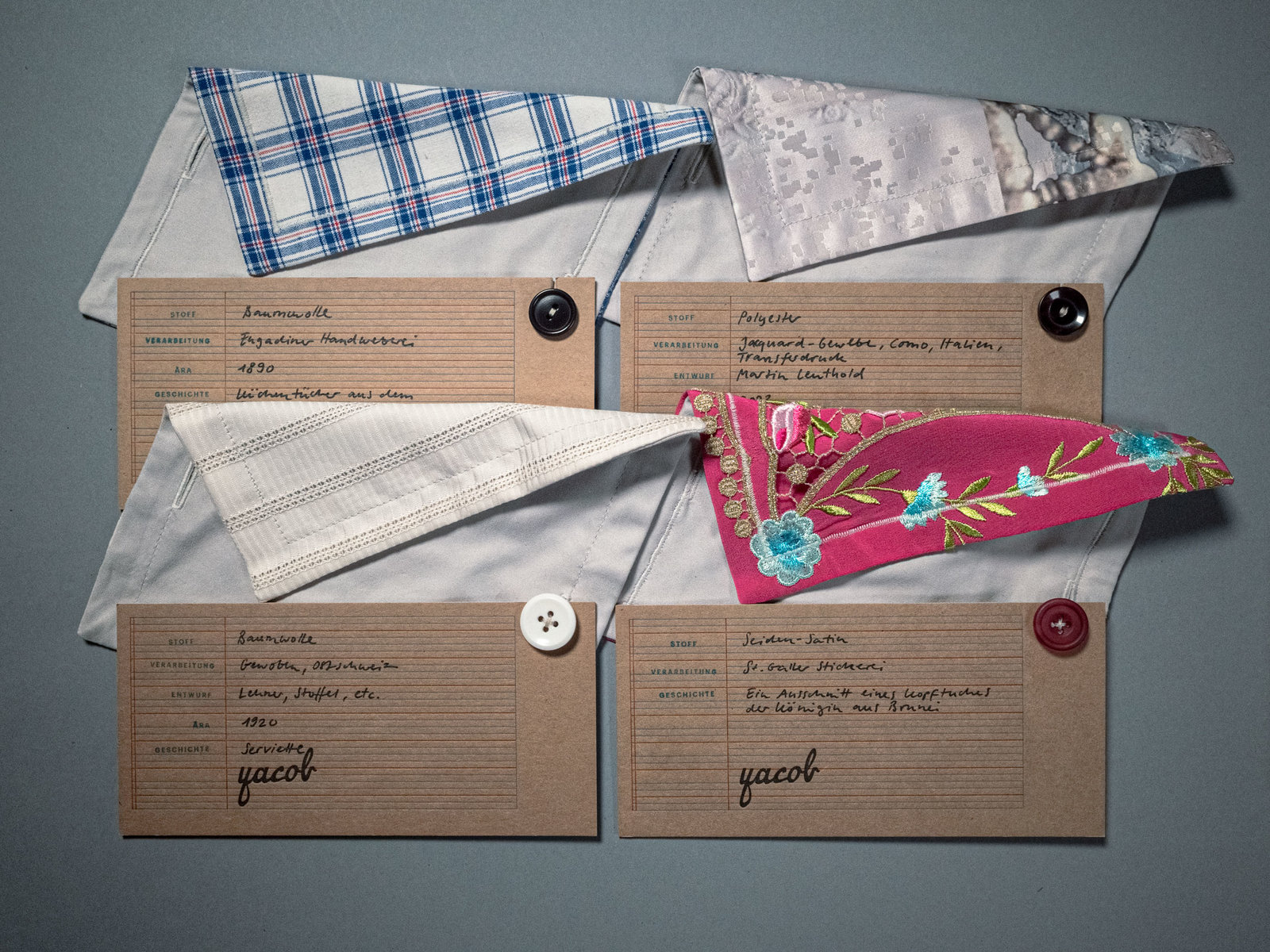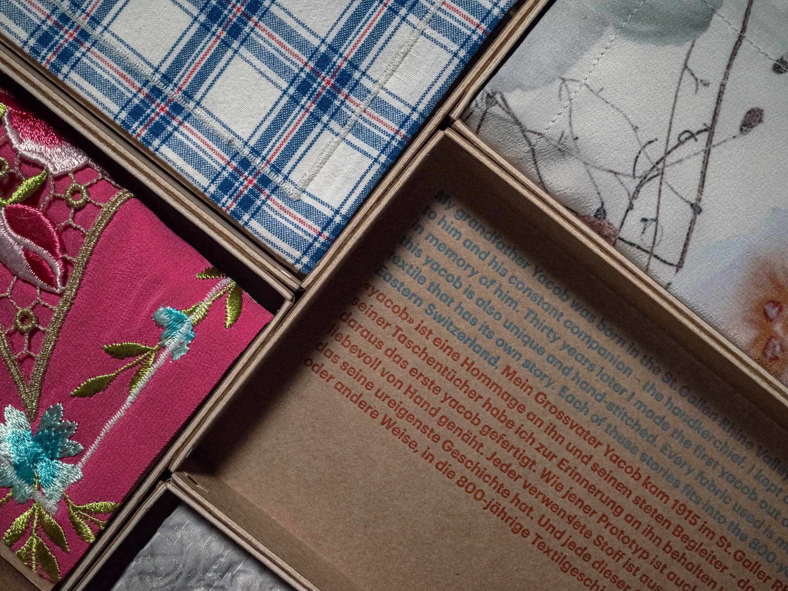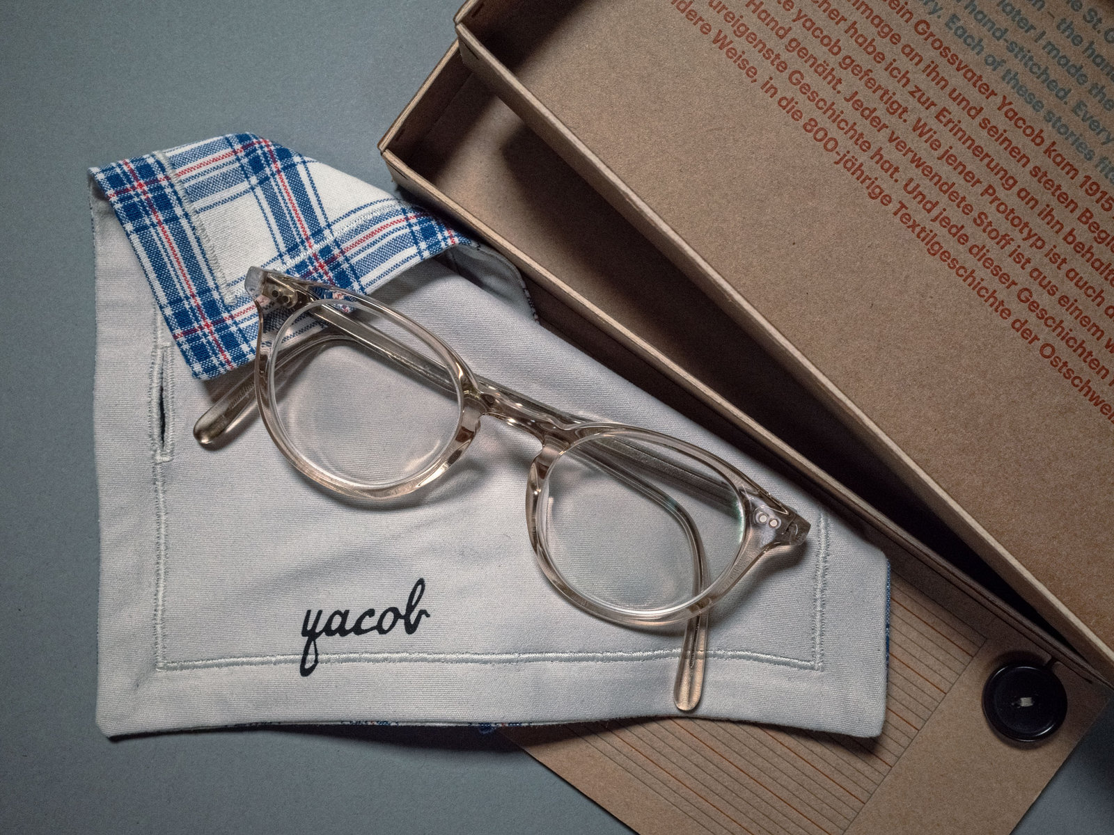 Platzhirsch OptikAlltag-Gründer und Mitinhaber Marcus Gossolt kuratiert exklusiv für das St.Galler Brillengeschäft Platzhirsch Optik das Brillenputztuchlabel YACOB. Alle Putztücher sind Unikate und werden aus ausgesuchten wiederverwerteten Stoffen mit Textilgeschichte gefertigt. Genäht werden die Tücher in St.Gallen von der preisgekrönten Couture-Schneiderin Karin Bischoff und ihrem Die Manufaktur-Team. Auf der einen Seite das Stück Textil mit Geschichte, auf der anderen Seite feinste Mikrofaser für die Reinigung von Brillengläsern. Ein Knopfloch erlaubt ein ausgeklügeltes Falt- und Wickelsystem, welches sowohl die reinigende Seite des Tuches in der Hosentasche schützt als auch das gut geschützte Einrollen einer Brille ermöglicht.