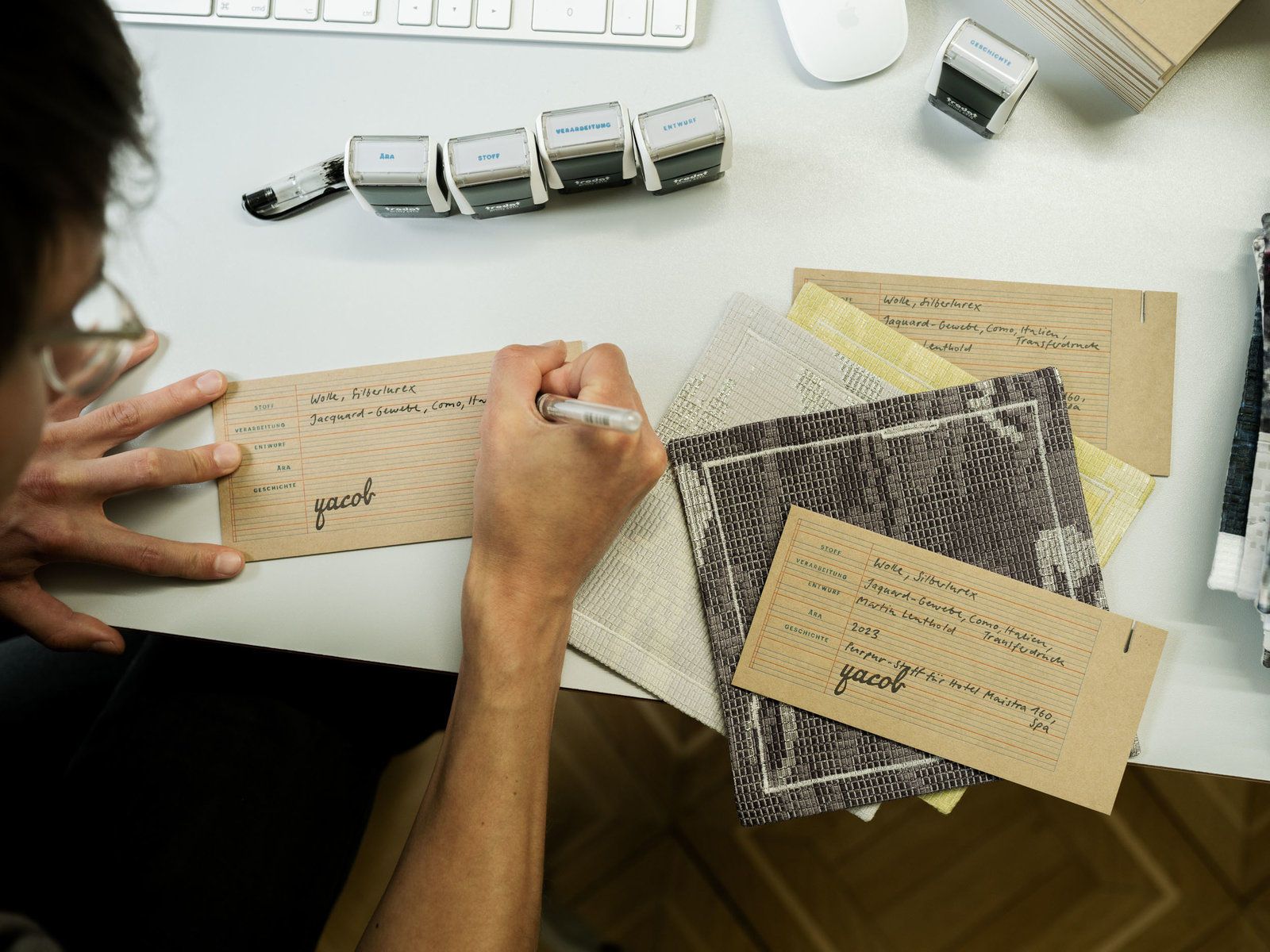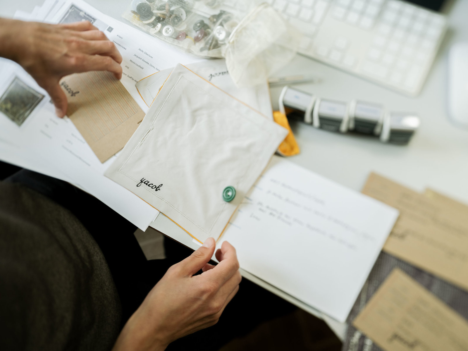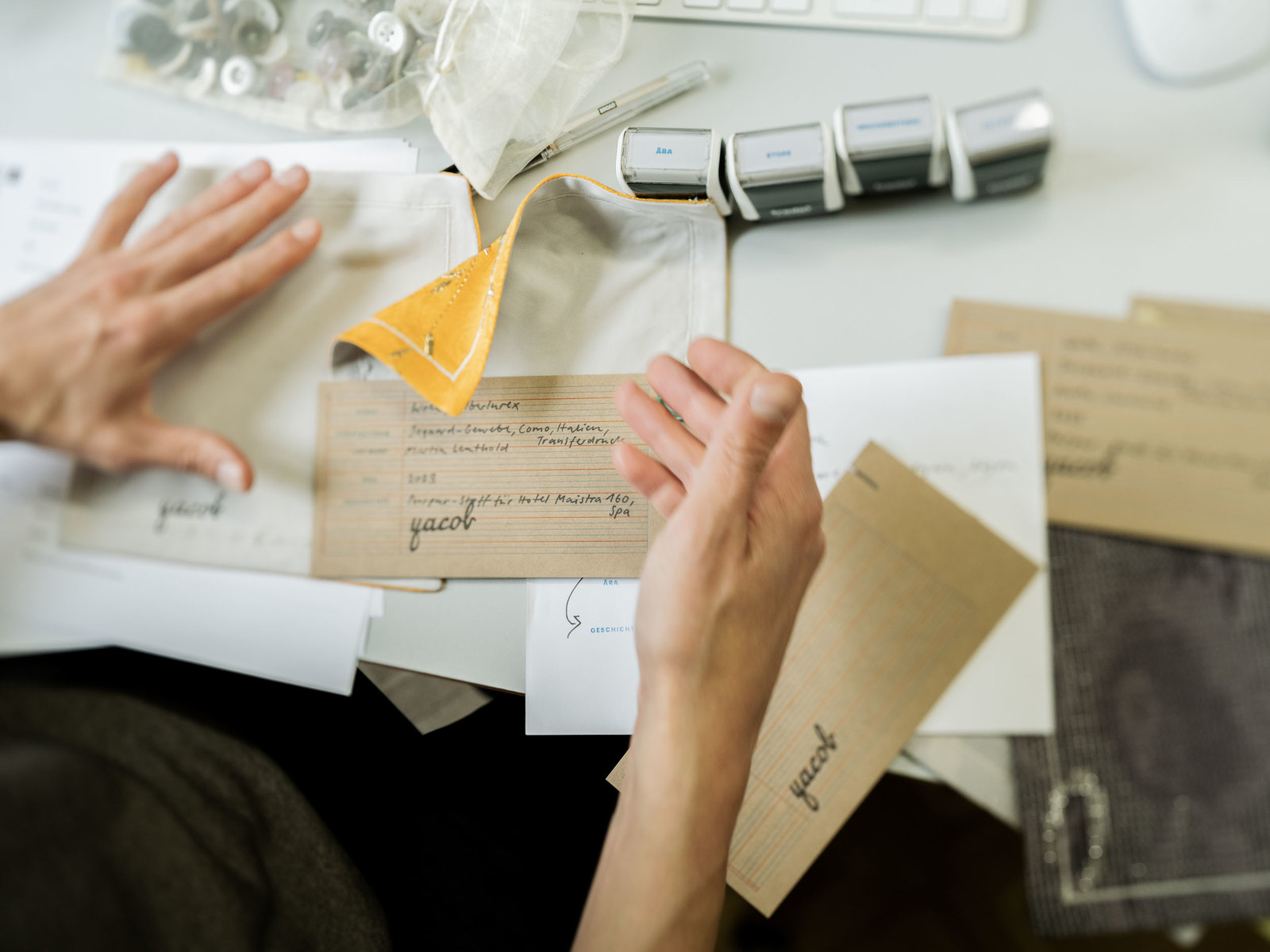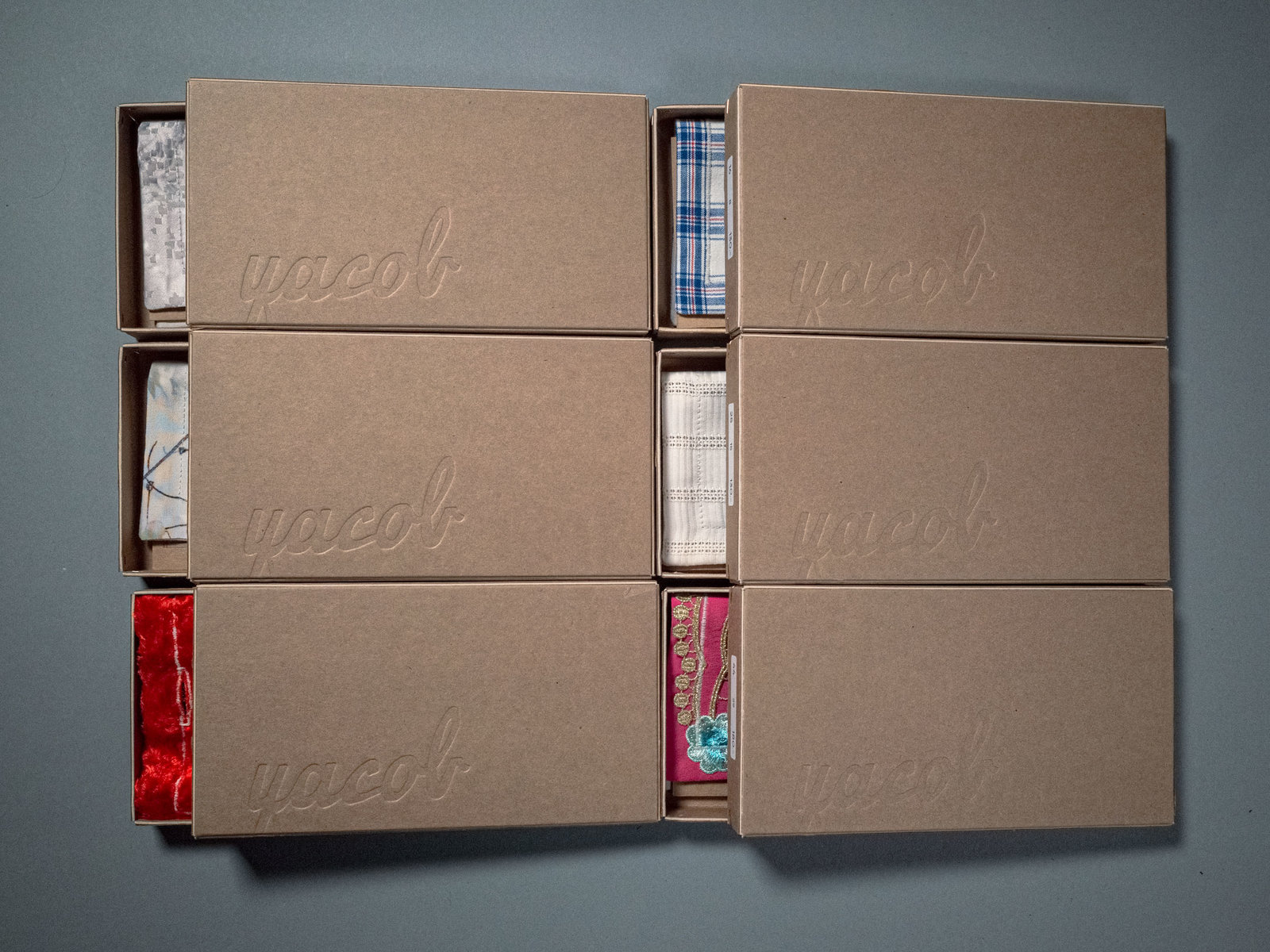 Platzhirsch OptikAlltag-Gründer und Mitinhaber Marcus Gossolt kuratiert exklusiv für das St.Galler Brillengeschäft Platzhirsch Optik das Brillenputztuchlabel YACOB. Alle Putztücher sind Unikate und werden aus ausgesuchten wiederverwerteten Stoffen mit Textilgeschichte gefertigt. Genäht werden die Tücher in St.Gallen von der preisgekrönten Couture-Schneiderin Karin Bischoff und ihrem Die Manufaktur-Team. Auf der einen Seite das Stück Textil mit Geschichte, auf der anderen Seite feinste Mikrofaser für die Reinigung von Brillengläsern. Ein Knopfloch erlaubt ein ausgeklügeltes Falt- und Wickelsystem, welches sowohl die reinigende Seite des Tuches in der Hosentasche schützt als auch das gut geschützte Einrollen einer Brille ermöglicht.