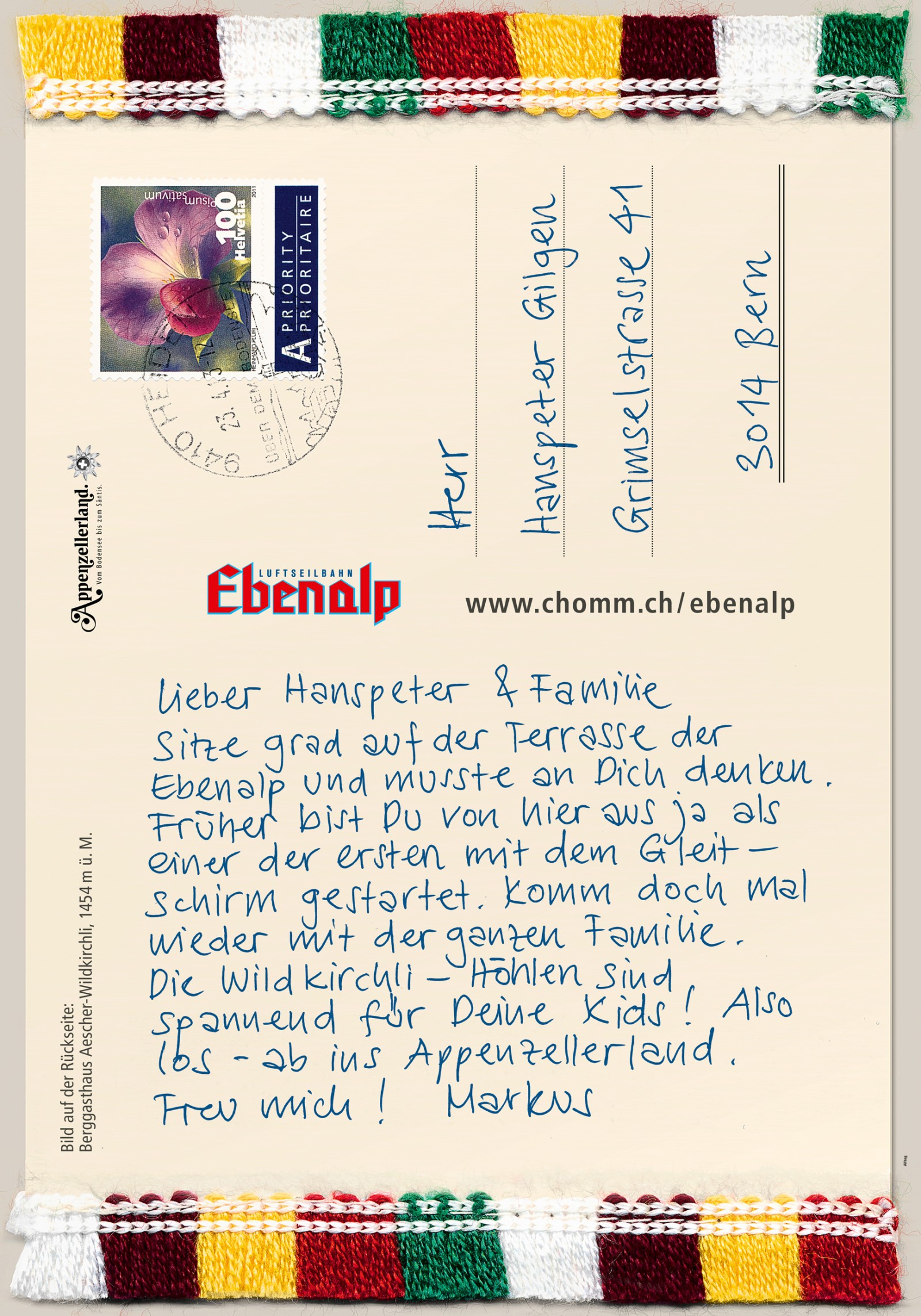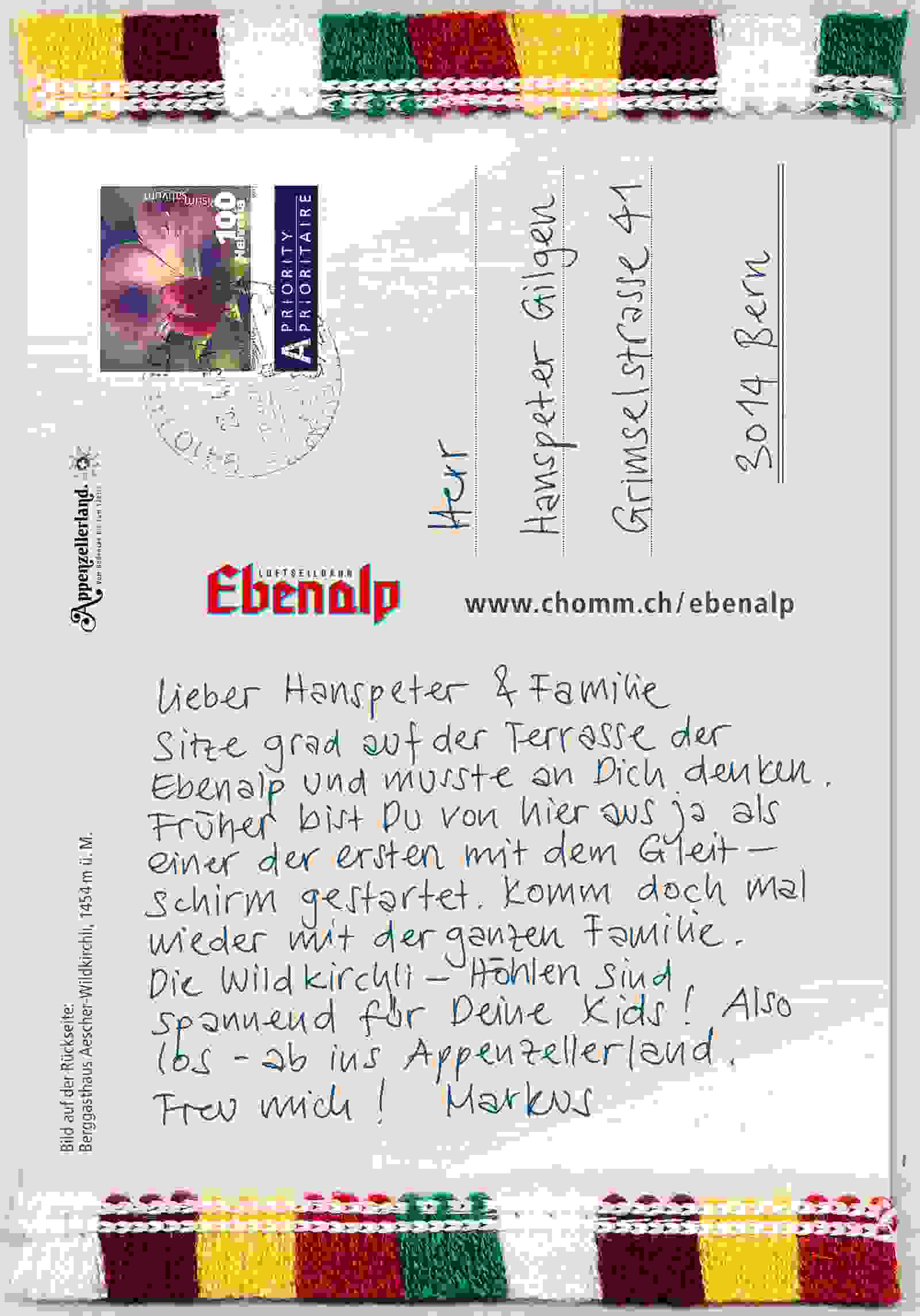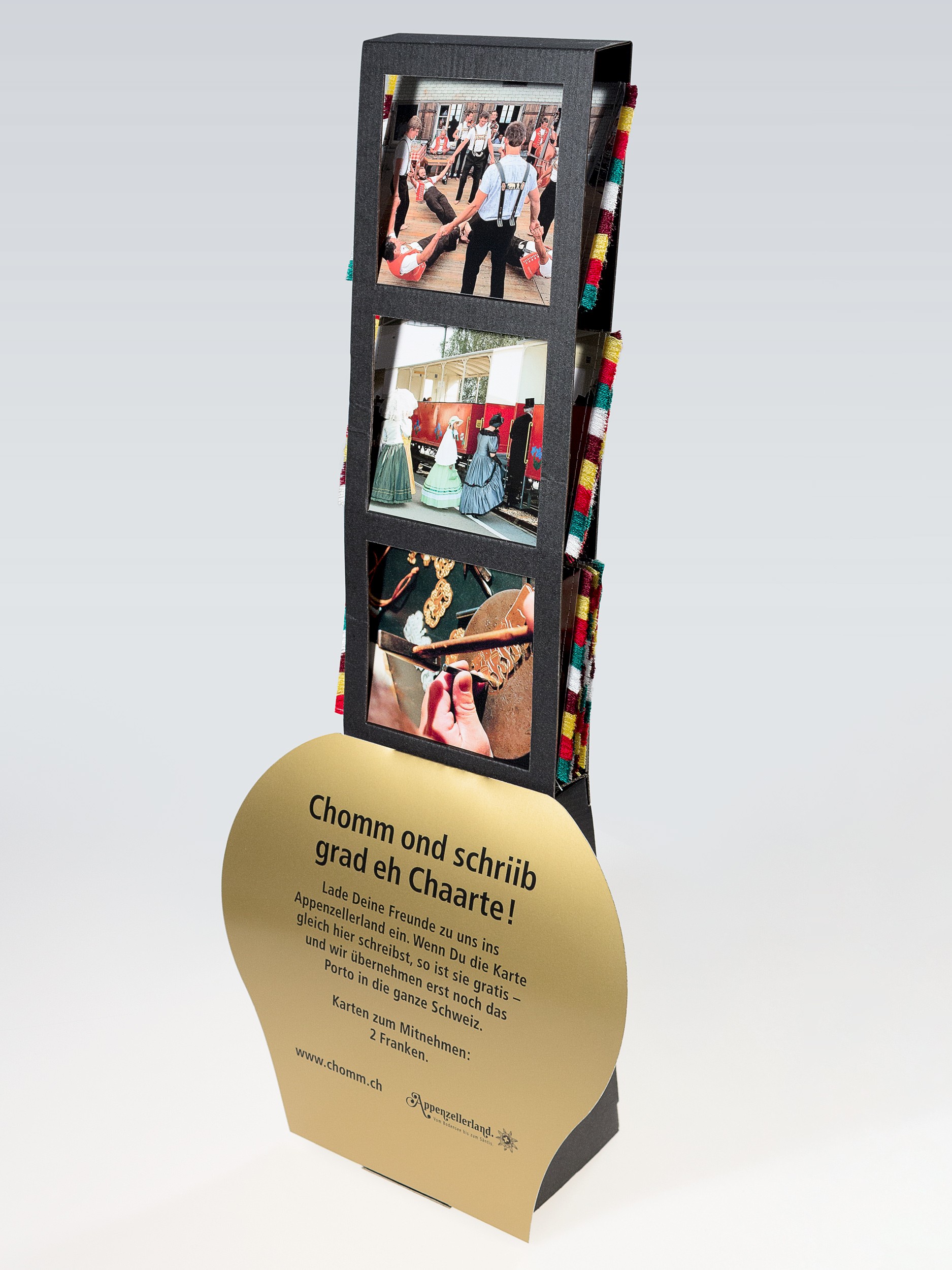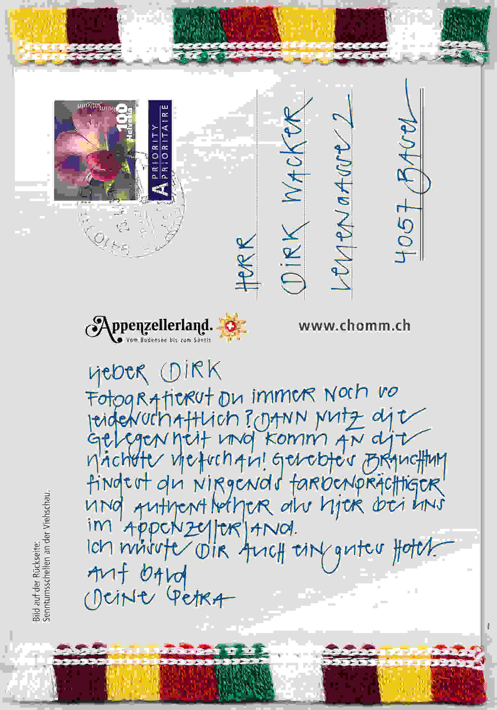 Handgeschriebene Postkarten mit Kuhglockenverzierung wurden an Freundinnen und Freunde, Verwandte und Unbekannte in der ganzen Schweiz verschickt. Im Laufe dieses Jahres werden etwa 24'000 Karten mit persönlichen Einladungen in Schweizer Briefkästen flattern. Ausserhalb der Schreibtage liegen die Postkarten mit Bildern von Appenzeller Brauchtums- und Traditionsmomenten an touristischen Hotspots auf. Appenzellerland Tourismus AR spendiert die Briefmarke. Begleitend haben wir eine Plakataktion entwickelt.