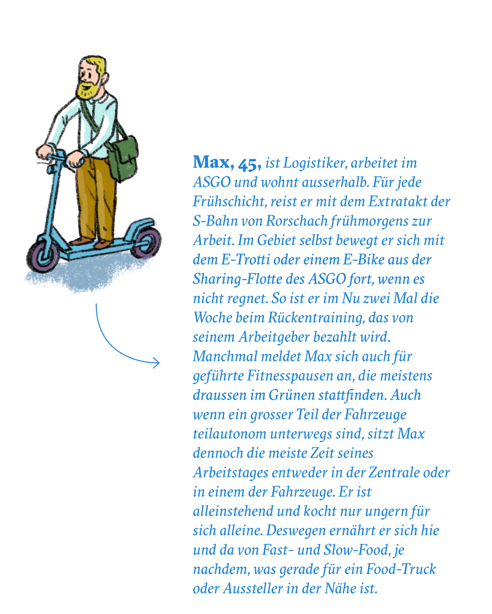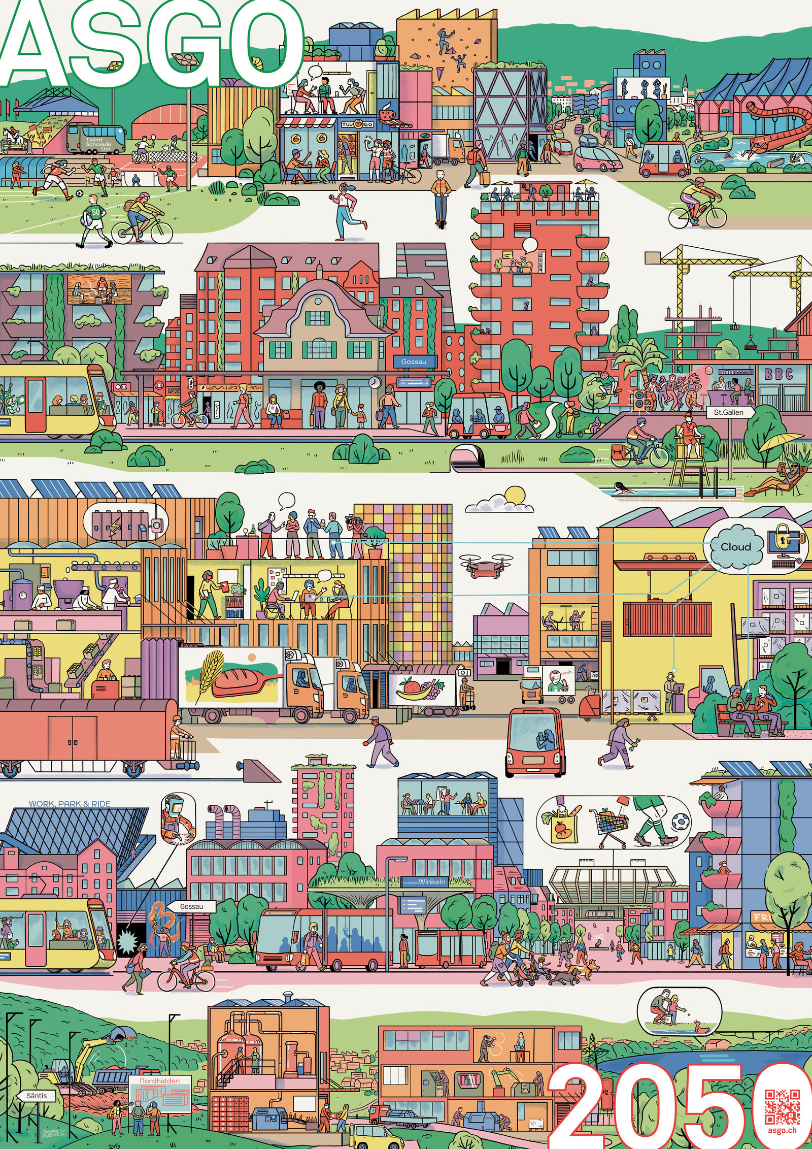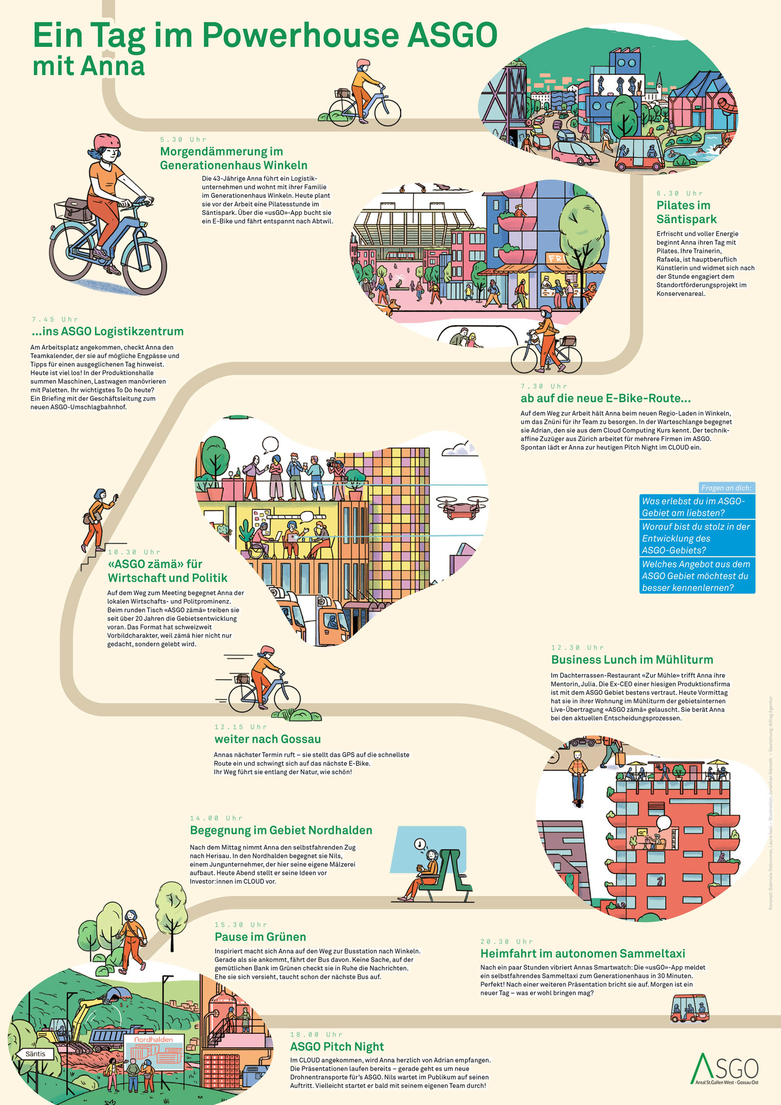 Wie macht man eine Entwicklungsplanung greifbar? Gabriela Debrunner und Laura Iseli haben sich dieser Herausforderung angenommen und eine Vision für das Areal für 2050 in Zusammenarbeit mit der Projektleitung und dem Kernteam des Massnahmenbündels «M1 Standortförderung» erstellt. Um diese den Stakeholdern zu vermitteln, haben wir gemeinsam die Idee eines Visionsbildes und eines Tagesablaufs im Leben der ASGO-Bewohnerin Anna entwickelt. Das Ergebnis war ein Plakat, das es schafft, den Mehrwert auf kleinem Raum zu visualisieren und zu erzählen. Die Vision zeigt die komplexen bestehenden und künftigen Zusammenhänge der Standorte sowie die Vorteile für Freizeit, Arbeit und Wohnen.