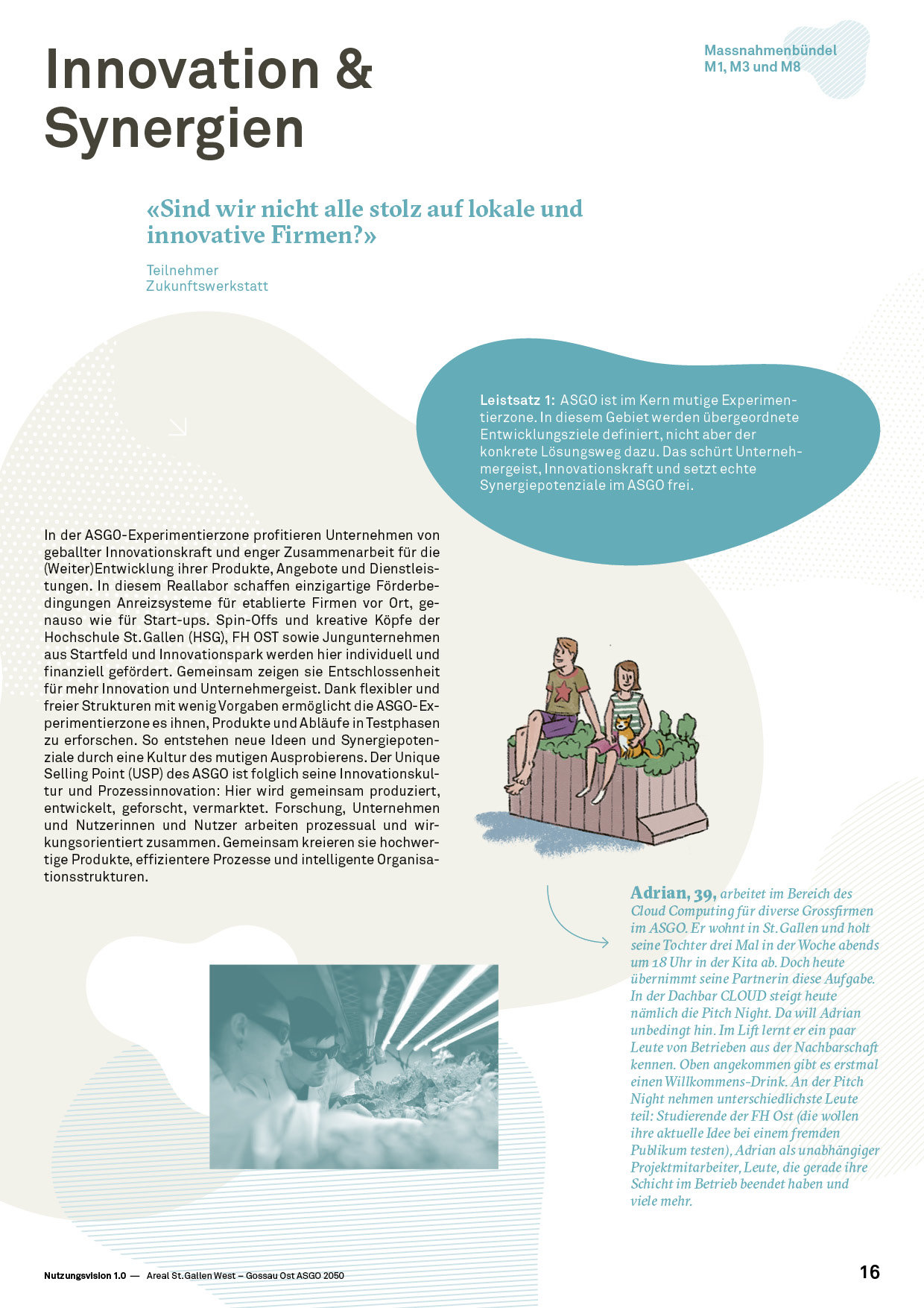 Die ASGO Nutzungsvision wurde in Zusammenarbeit mit dem Kernteam des Massnahmenbündels «M1 Standortförderung» sowie insgesamt 62 Akteur*innen in drei partizipativen Zukunftswerkstätten erarbeitet. Die Nutzungsvision thematisiert und beschreibt ein erstes Mal wie das ASGO-Gebiet in den Jahren 2030, 2040 und 2050 aussehen könnte. Wer sich wie im Perimeter bewegt und wo welche Schwerpunktnutzungen sind. Die Nutzungsvision übernimmt somit eine übergeordnete und richtungsweisende Funktion.