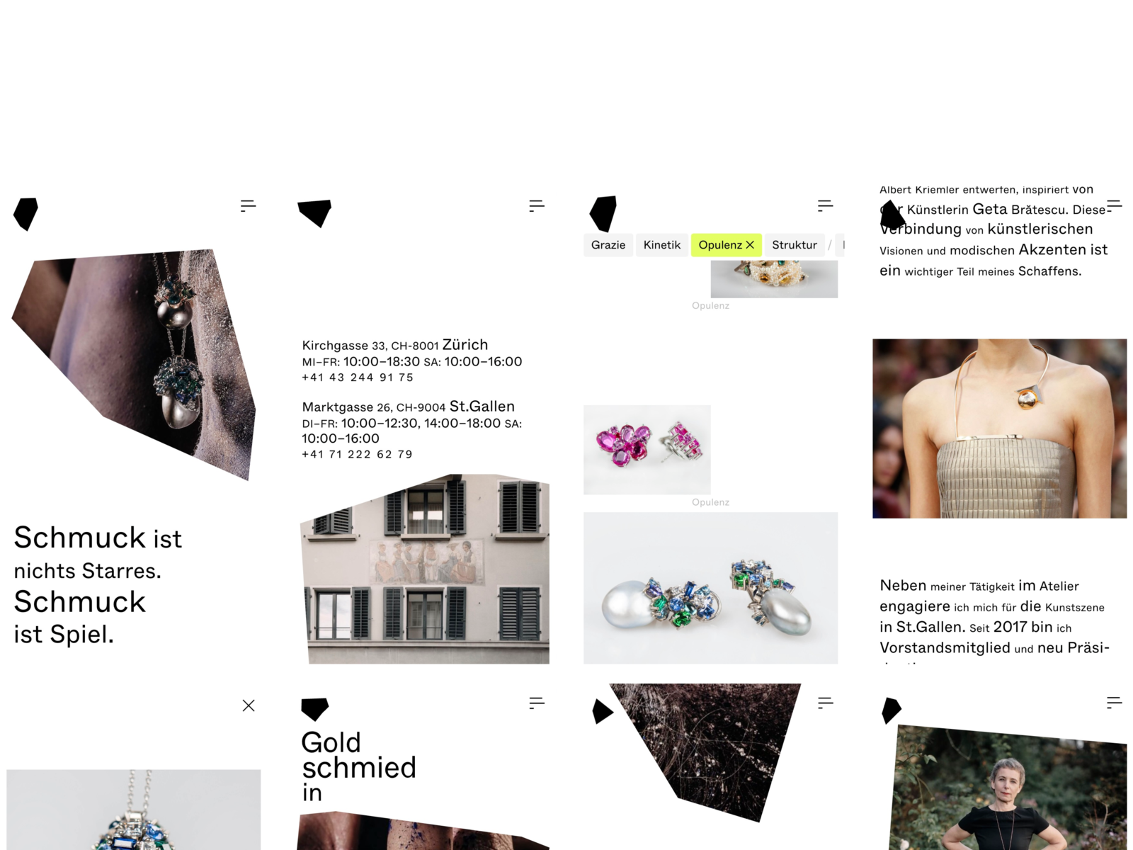 Für Gabriela Frei durften wir einen neuen Auftritt konzipieren und umsetzen. Ausgangspunkt war ihr (Nach-)Name, den wir als Leitmotiv aufgriffen: Aus dem bestehenden Logo entwickelten wir freie Formen, die sich in Varianten auf der Webseite und auf Drucksachen wiederfinden. Auch die typografische Gestaltung folgt diesem freien Umgang. Und zugleich versuchten wir die Art und Weise wie Gabriela Frei ihren Schmuck gestaltet, im Neuauftritt aufzugreifen. Präzise, kunstvoll und verspielt.