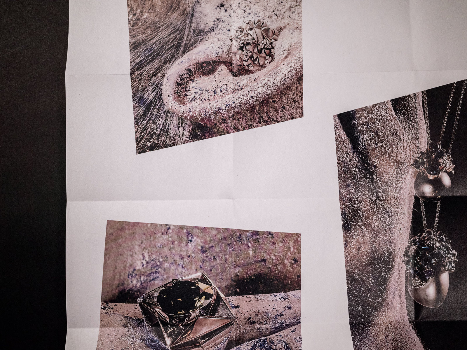 Die Bildwelt, ob sie nun den Schmuck oder das Handwerk zeigt, lebt von unmittelbarer Nähe. Die Aufnahmen setzen die Schmuckstücke in Szene – nah am Körper, mit Pigmenten bespielt, poetisch und sinnlich.