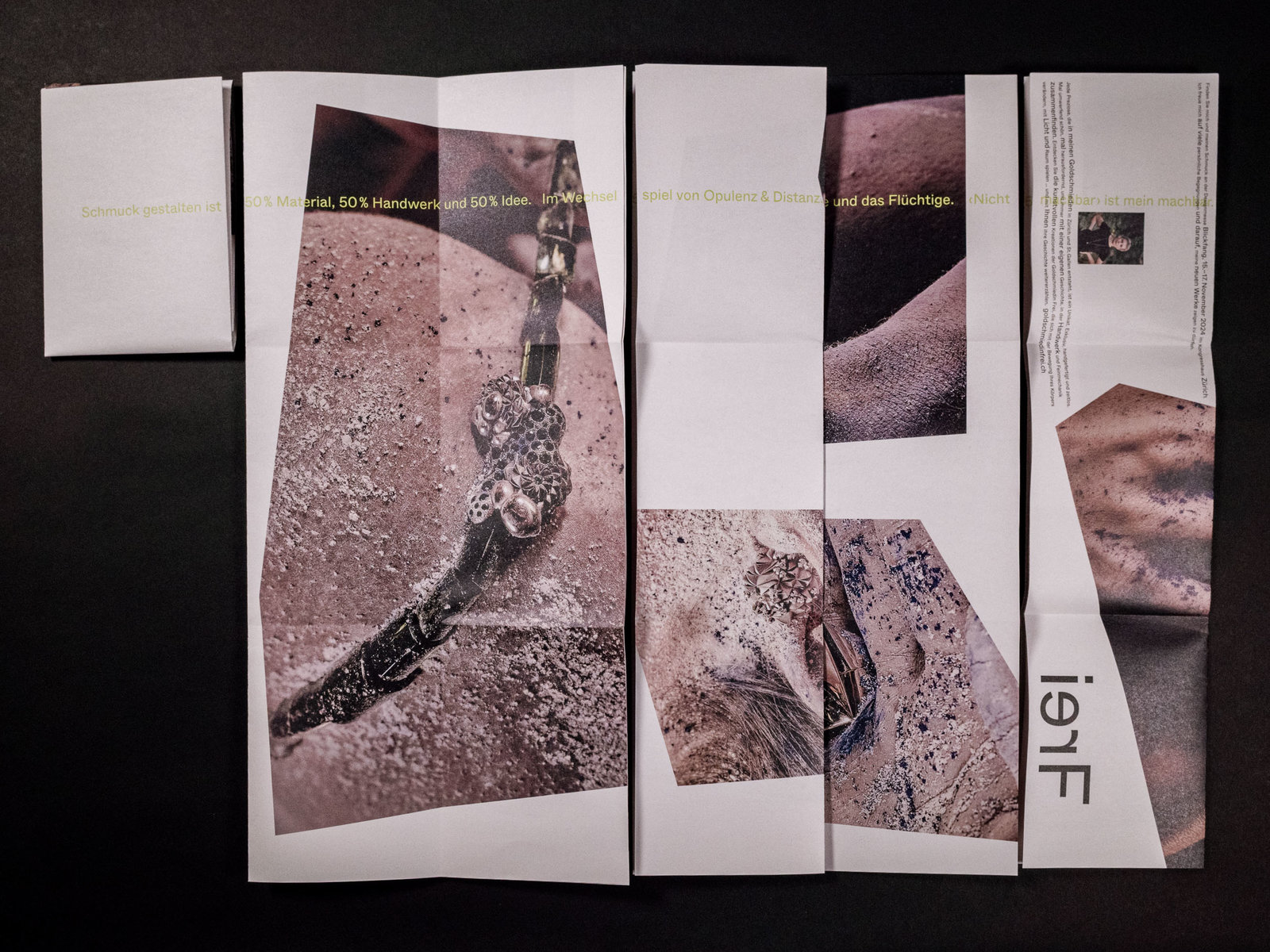 Um auch analog auf den neuen Auftritt und das Angebot der Goldschmiedin aufmerksam zu machen, entwafren wir einen neuen, grosszügigen Falzflyer. Der spezielle Falz kommt ohne Heftung aus und zeigt den Schmuck in voller Wirkung.