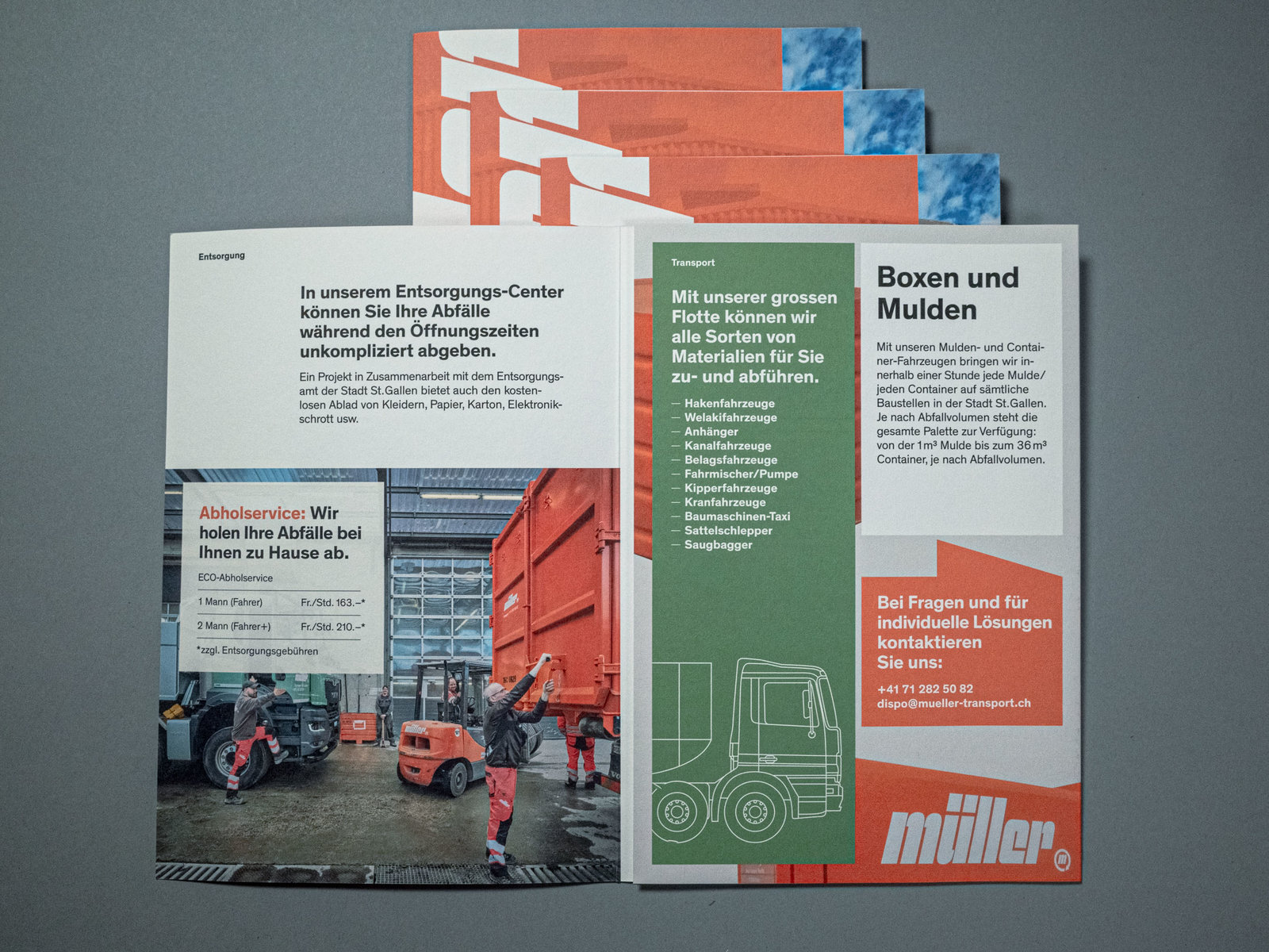 mueller-transport.chMüller bietet eine breite Palette an Dienstleistungen an: vom Muldenservice über die Kanalreinigung bis hin zum Recycling. Um die Vielfalt dieser Angebote in einem handlichen Format aufzuzeigen, durften wir sowohl textlich wie auch gestalterisch einen Falzflyer umsetzen.