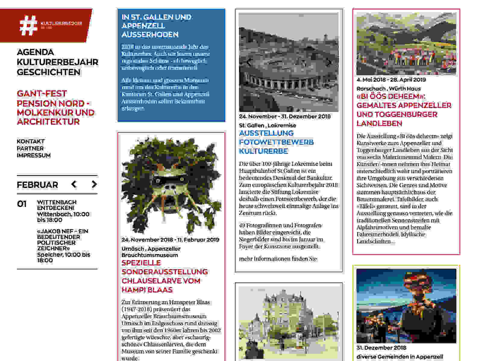 Eine Webseite mit einer Veranstaltungsagenda und Geschichten zum regionalen Kulturerbe mit weiterem unüblichem Inhalt. Wir übernahmen die Redaktion der Inhalte und Sammlung der Agendaeinträge. Zum Schluss fanden wir über 250 Kulturerbe-Veranstaltungen die Zentral gesammelt und präsentiert wurden sowie mehr als 20 detailliertere Geschichten zum Kulturerbe in SG-AR.