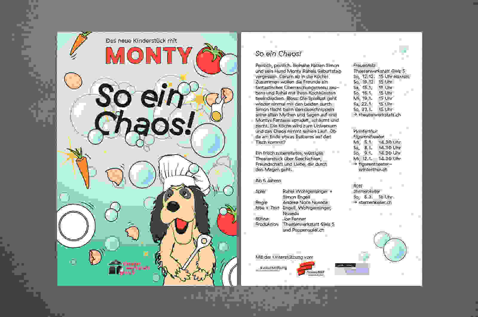 puppenspiel.chMonty stellt die Küche auf den Kopf. Im Kinderstück von Puppenspiel kocht er zusammen mit Simon einen Geburtstagsschmaus – Chaos ist hier vorprogrammiert. Für diesen Monty-Auftritt durften wir ein Logo kreieren für die gesamte geplante Serie, sowie die Plakate und Flyer illustrieren.