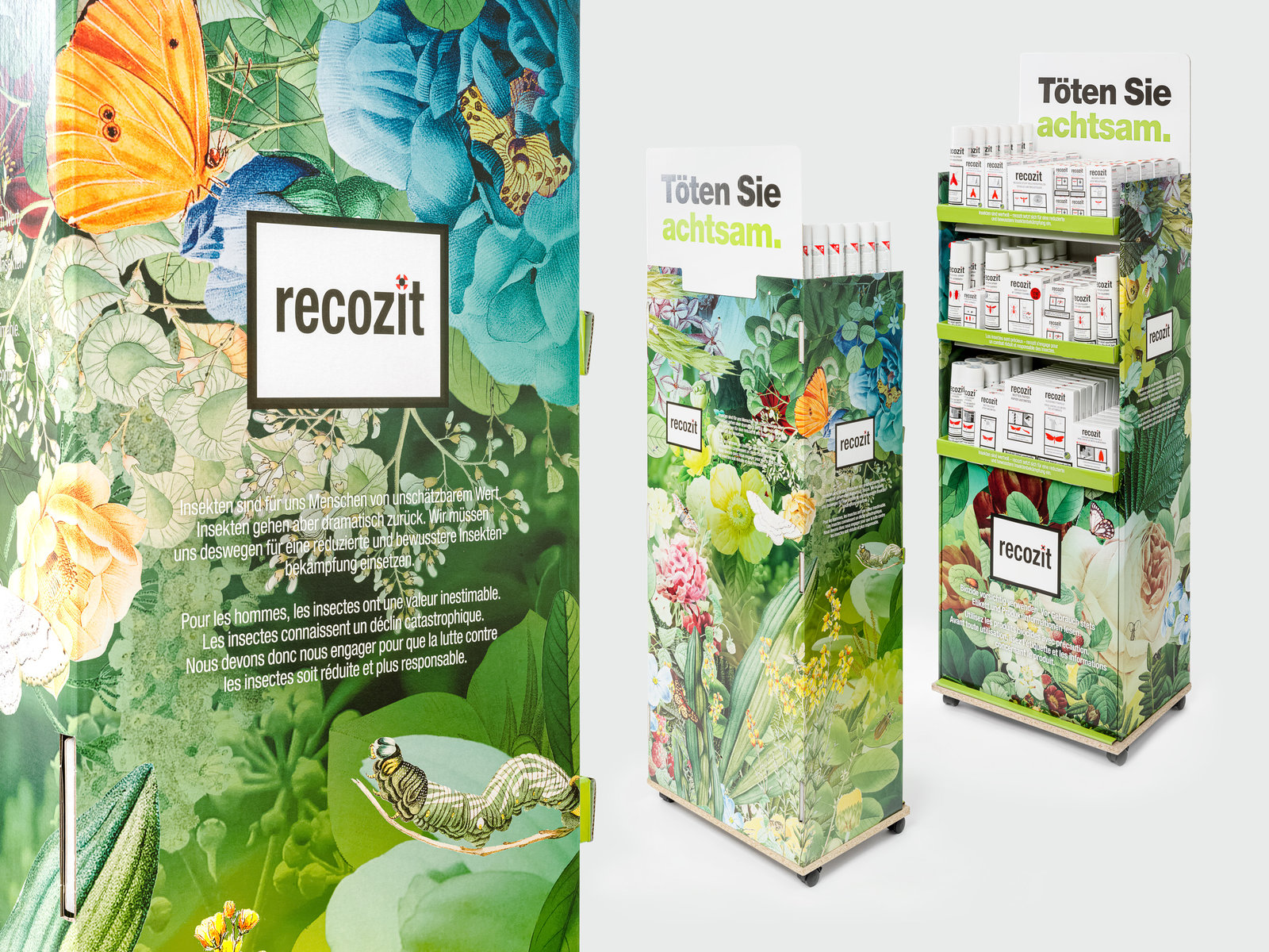 Mit diesem Display wollen wir zum Nachdenken bewegen ob die Insektenbekämpfung wirklich nötig ist. Und wenn doch, dann wenigstens mit den Recozit Produkten, weil ein Teil des Kaufbetrages in Ausgleichsflächen von INSECT RESPECT® investiert wird und den Insekten wieder zu Gute kommt.