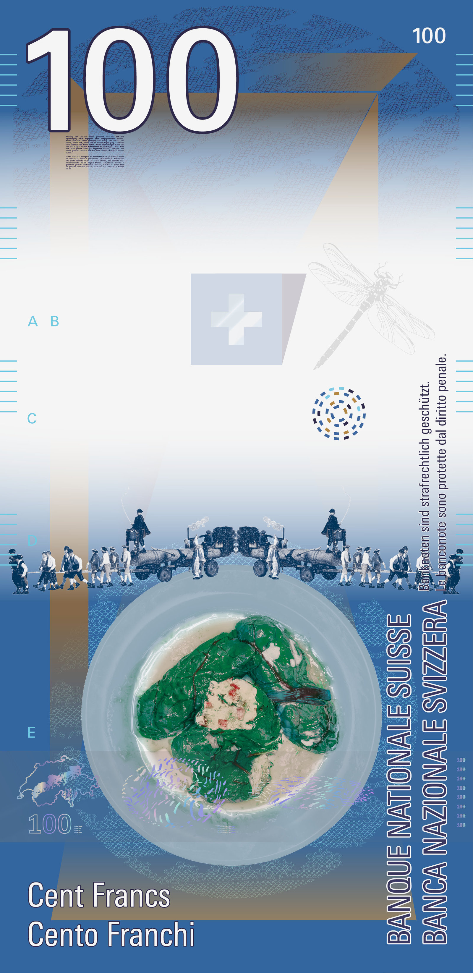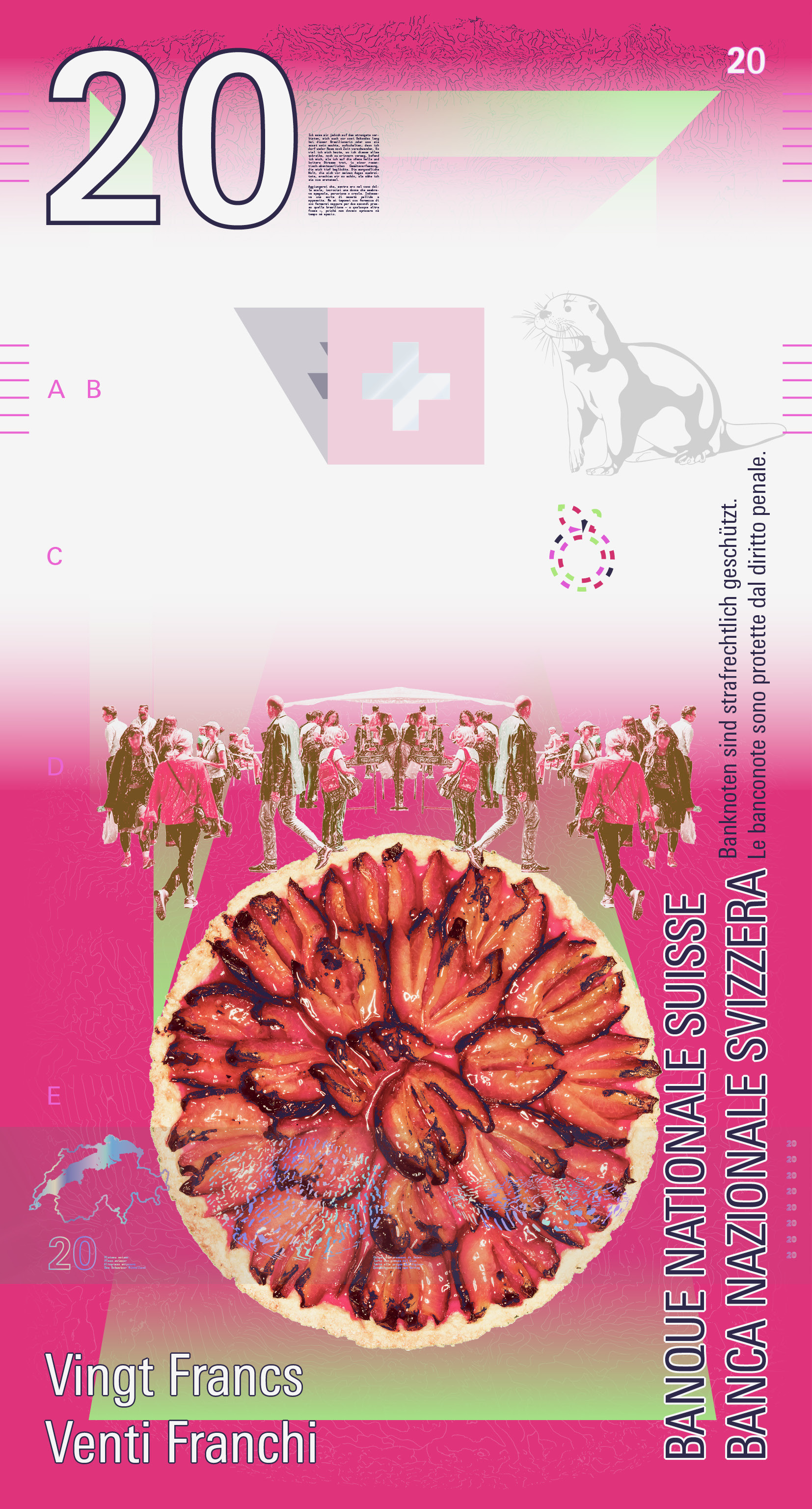 Auf der Vorderseite sorgt ein transparentes Schweizerkreuz für einen visuellen Anker. Es bleibt auf jeder Note an derselben Stelle und lässt den Blick durch die Serie hindurchwandern. Sein Schatten verändert sich mit dem Lauf der Sonne – ein subtiler Hinweis auf Zeit, Licht und Perspektive.